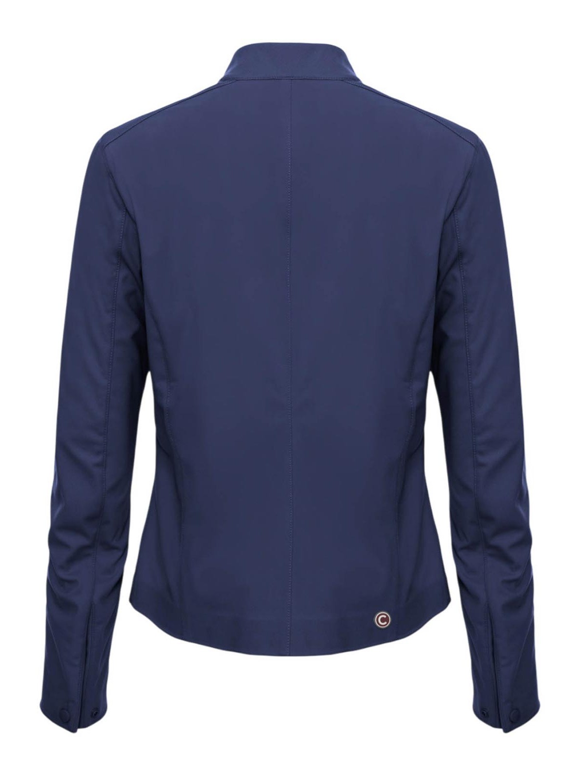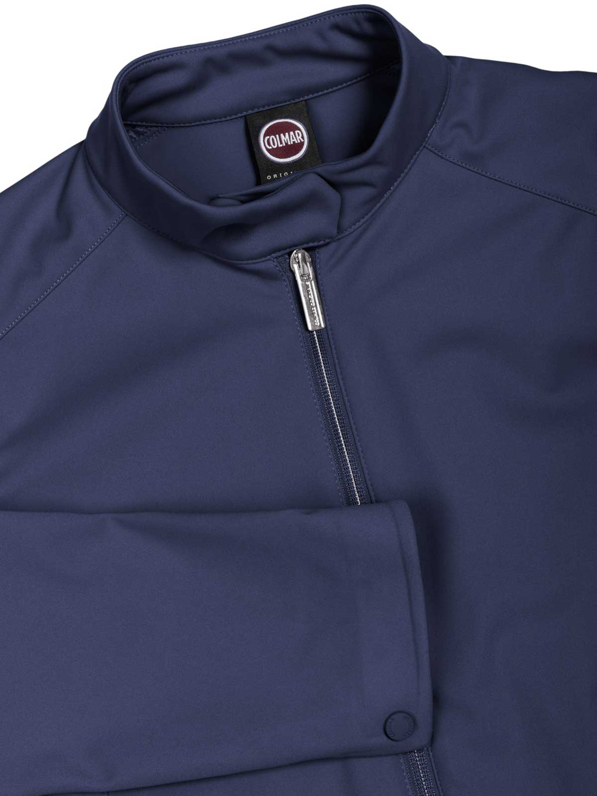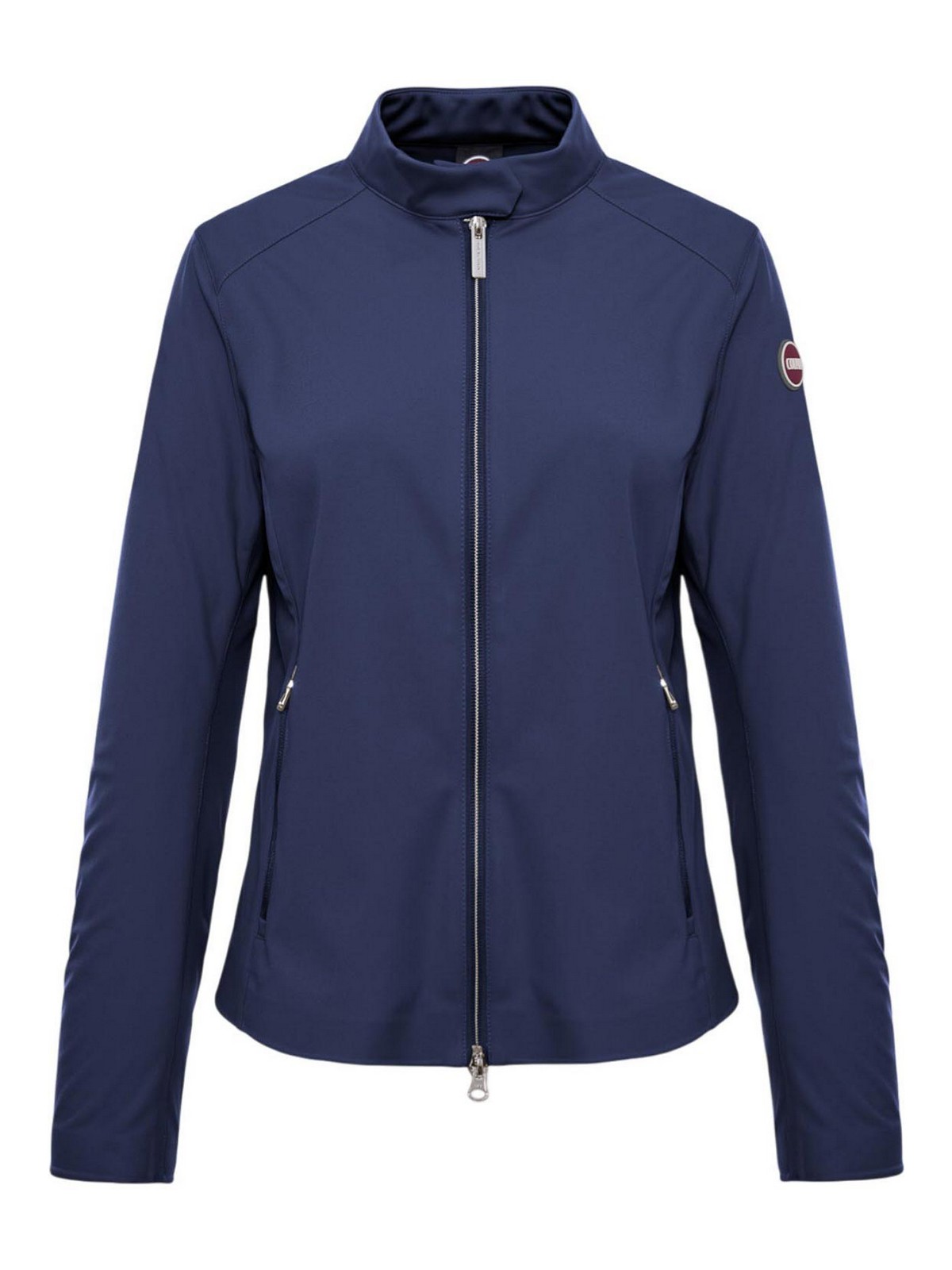 Colmar originals navy blue softshell biker jacket, waterproof women's jacket made of soft and light softshell, designed to combine technicality and femininity. the biker design gives character to the garment, enhancing the silhouette with a contemporary and dynamic line. the technical fabric ensures protection from the elements while maintaining comfort and breathability, while the functional details complete the model with a sporty and refined aesthetic. ideal for mid-season, perfect for urban looks with a strong taste., soft and light softshell fabric, biker design, zip closure, side pockets, non-padded garment, Colmar Originals logo applied on the left sleeve, patch C applied on the back, regular fit, external fabric composition: 100% polyester