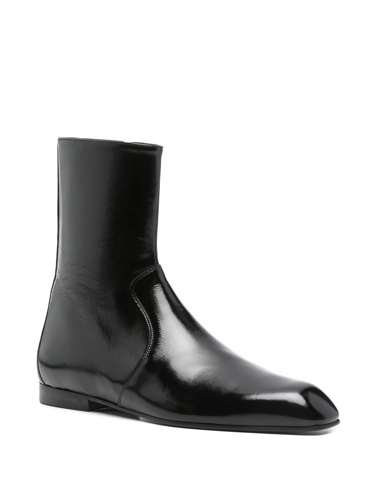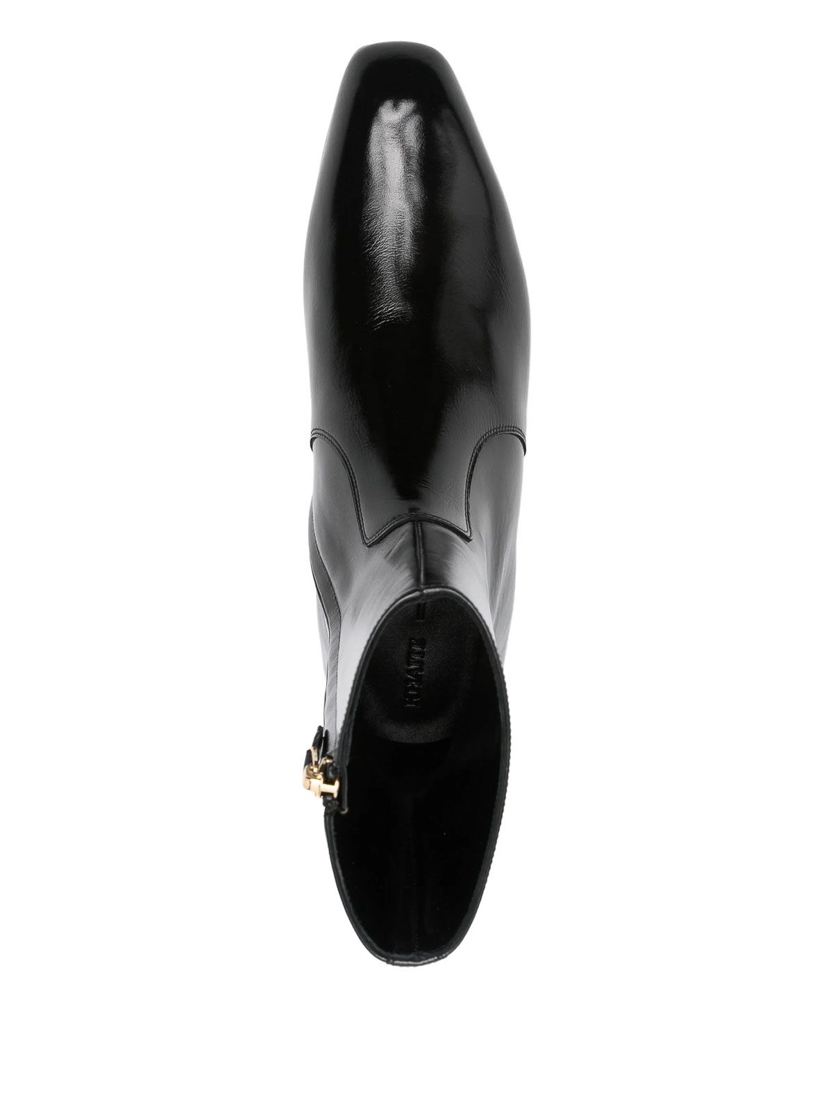 designer color: black glazed leather, calf leather, glossy finish, side-zip fastening, gold-tone hardware, pointed toe, flat sole, stacked heel, high shaft.