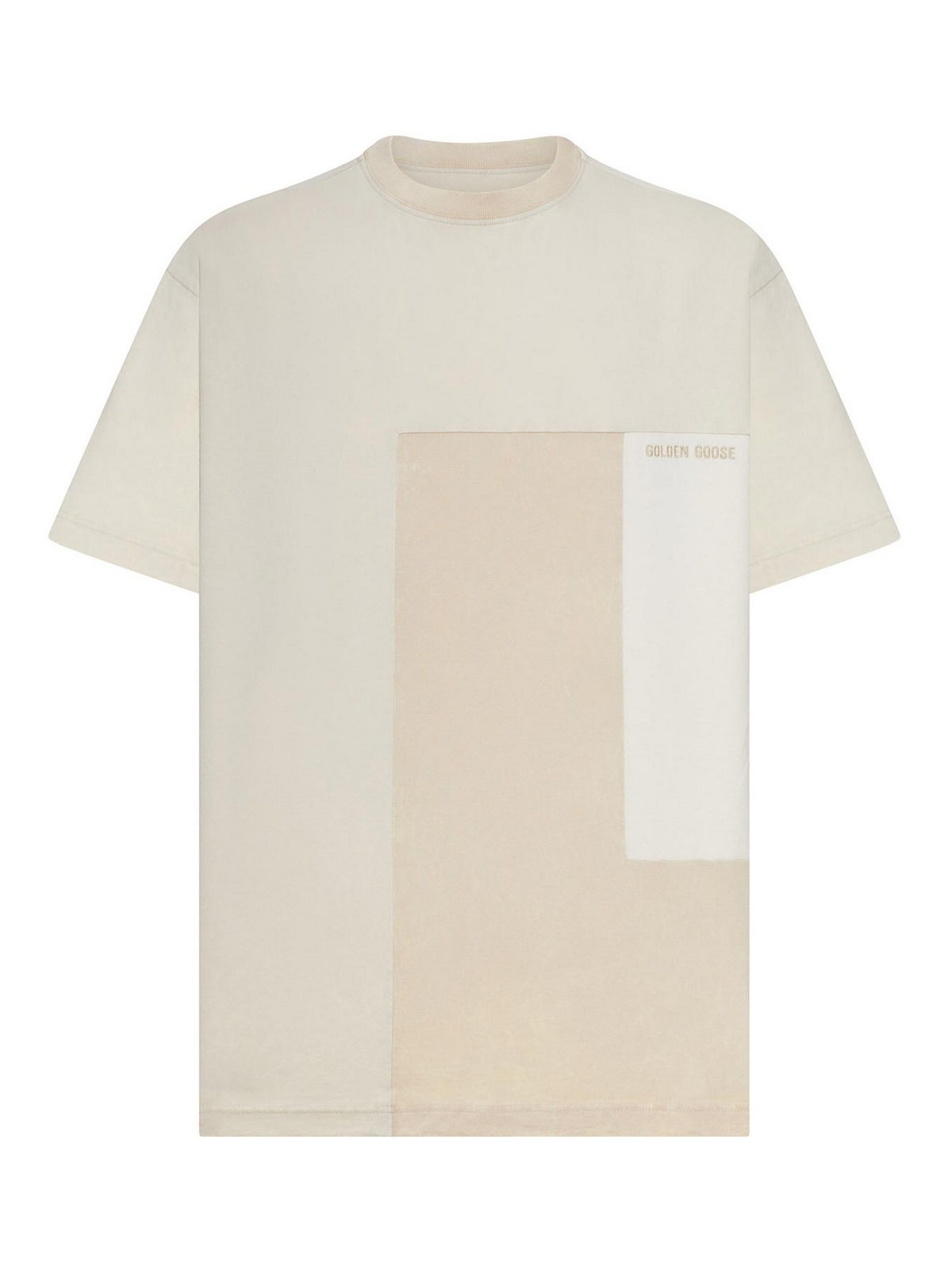 crew neck , loose fit, patchwork design with colorblock effect, golden goose logo embroidered on the chest, short sleeves, straight hem, 100% cotton, color: white/beige