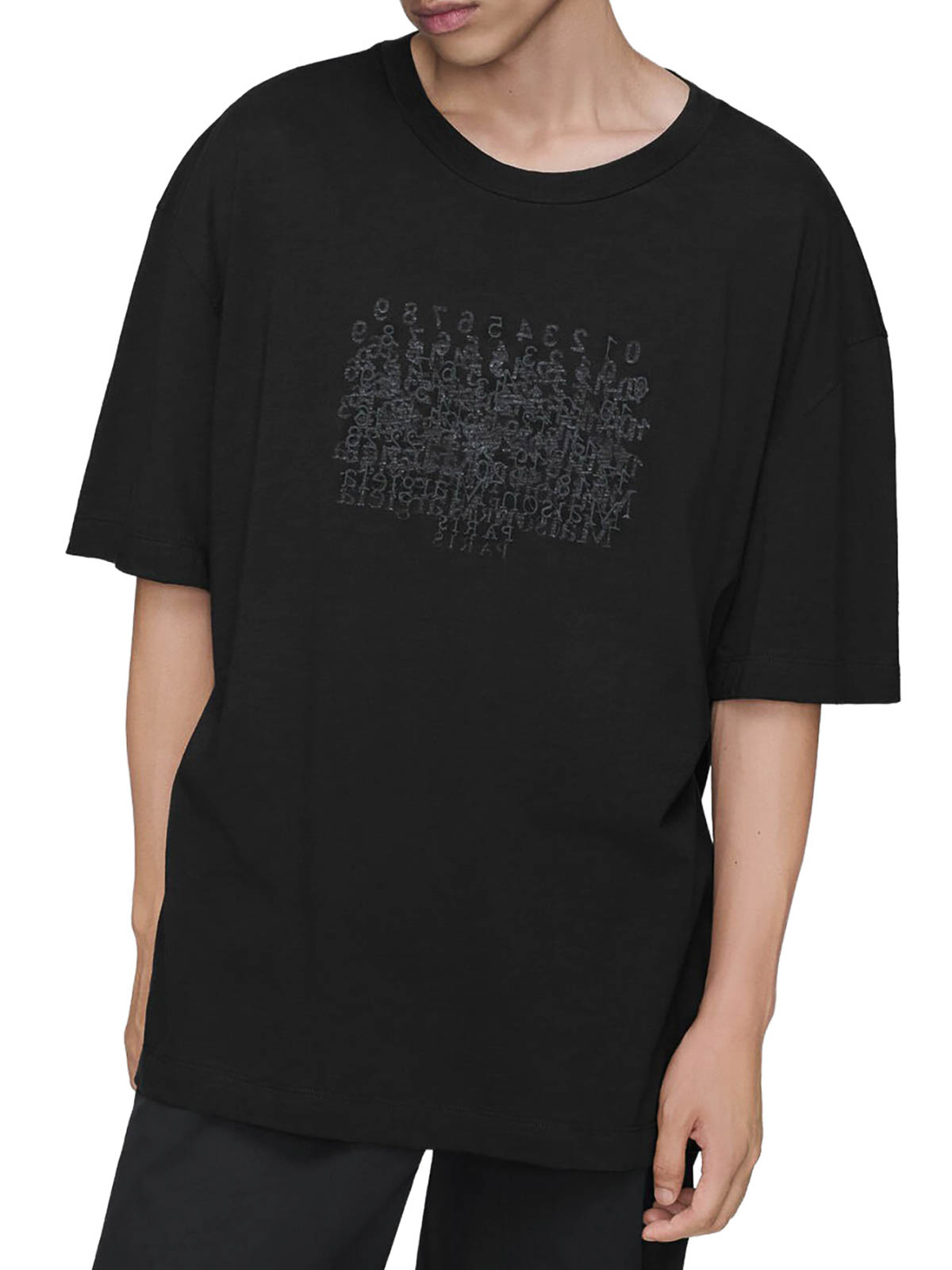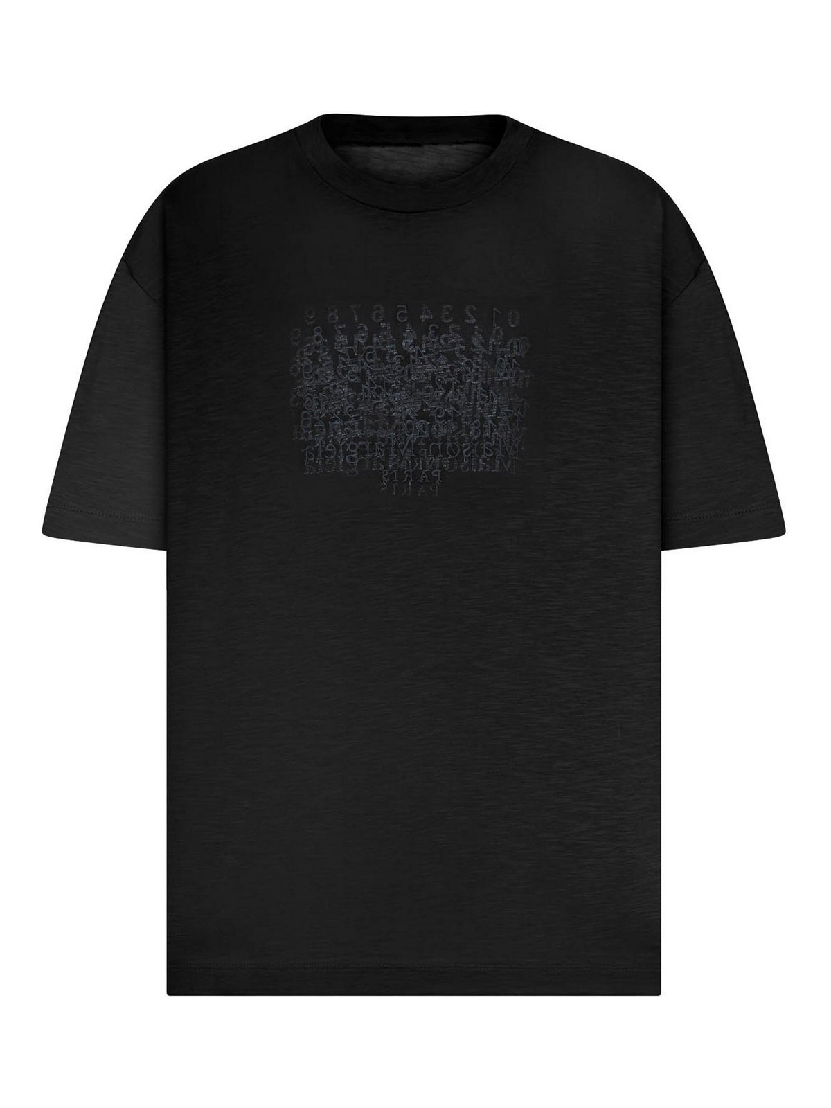 cotton jersey t-shirt, classic ribbed crewneck, short sleeves with slightly dropped shoulders, front print with maison margiela paris lettering and a faded number graphic, minimalist design with a central tone-on-tone graphic detail, straight hem with finished seams, regular fit, color: black