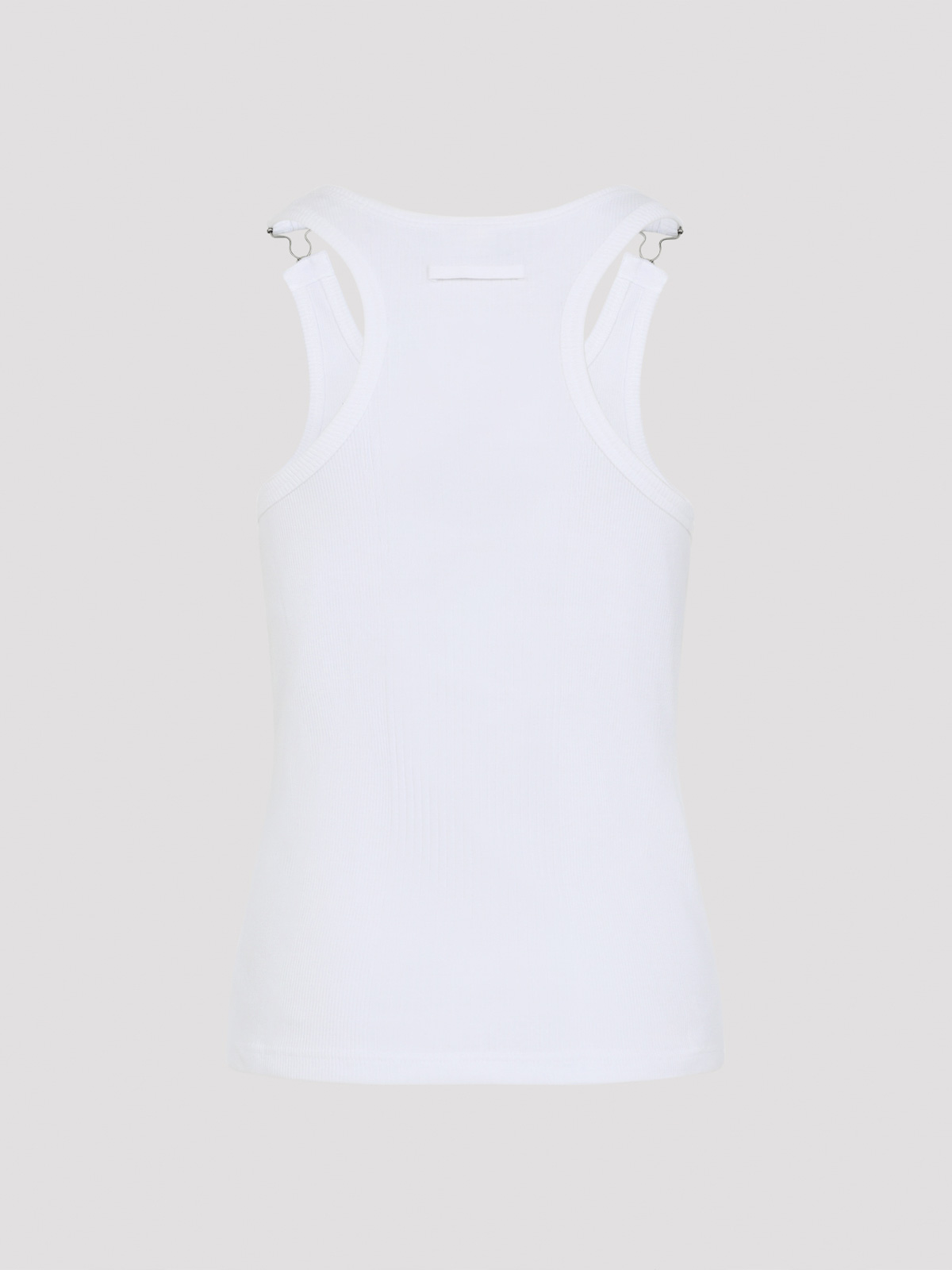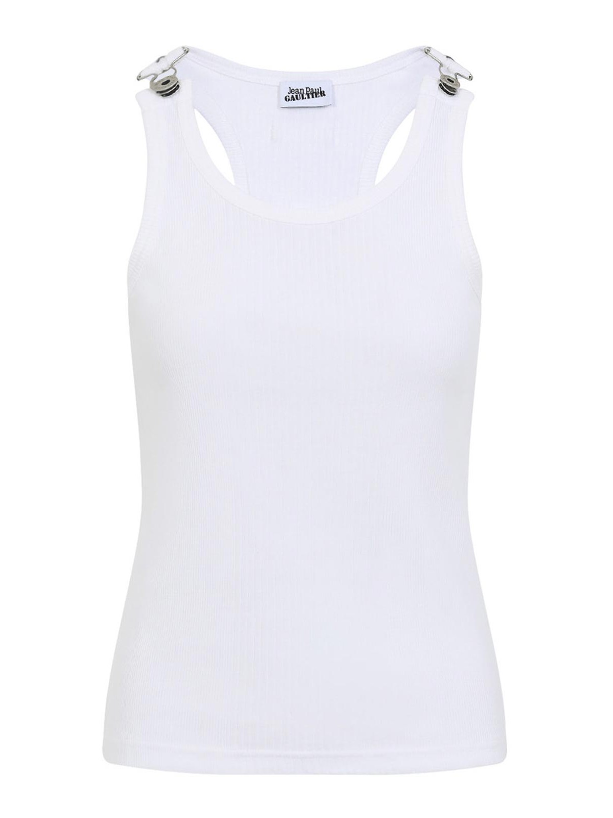 Jean paul gaultier white cotton tank top. crafted from white cotton with ribs that extend from the sides to the front, featuring a round neckline, silver-toned metal buckles on the straps, and a straight hem.