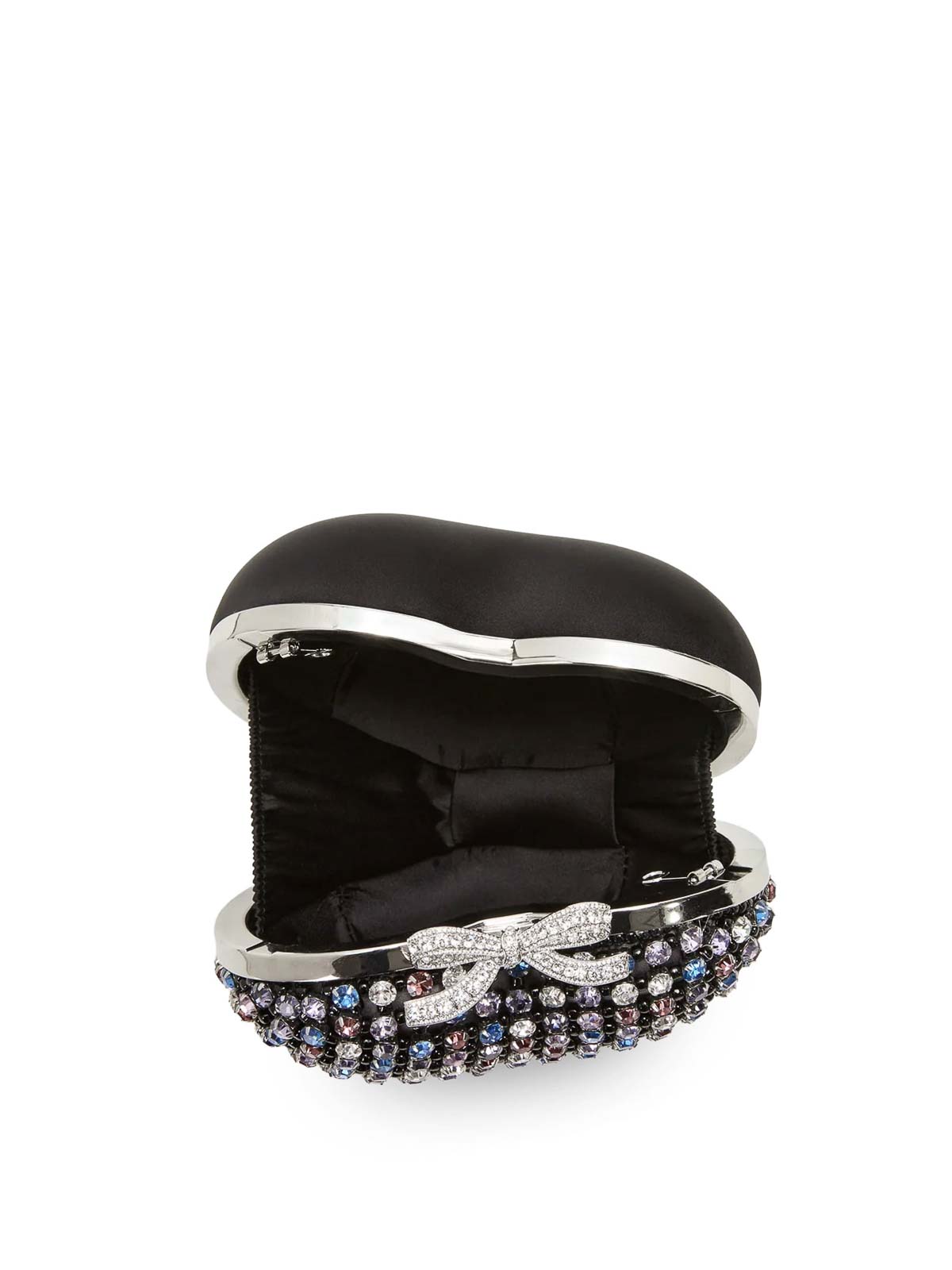 Magnetic closure, crystal bow, metal shoulder strap, satin/crystals, W: 18 cm, H: 15 cm, D: 3 cm.