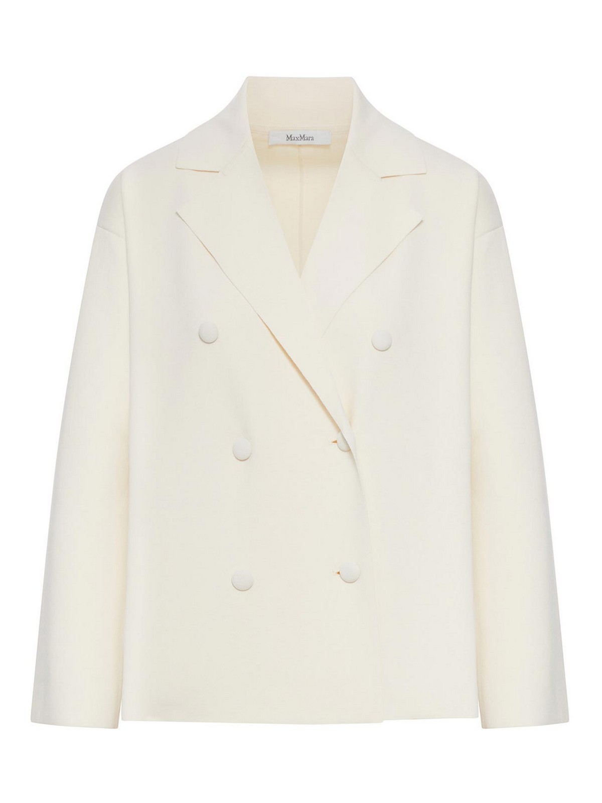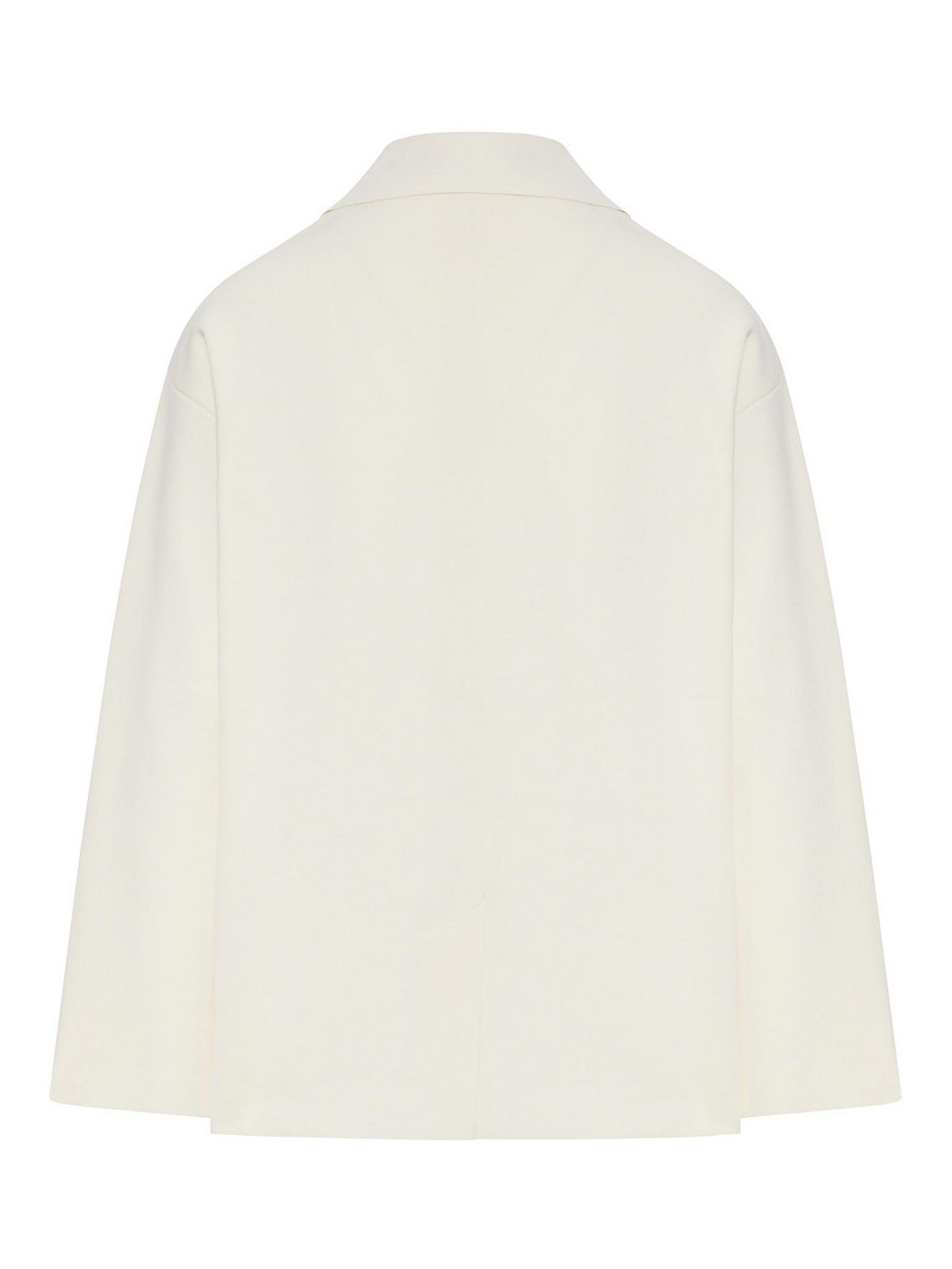 double-breasted jacket, interlock stitch, viscose crepe yarn, lapel collar, long, low-cut sleeves, covered button closure, unlined, relaxed fit, color: ivory