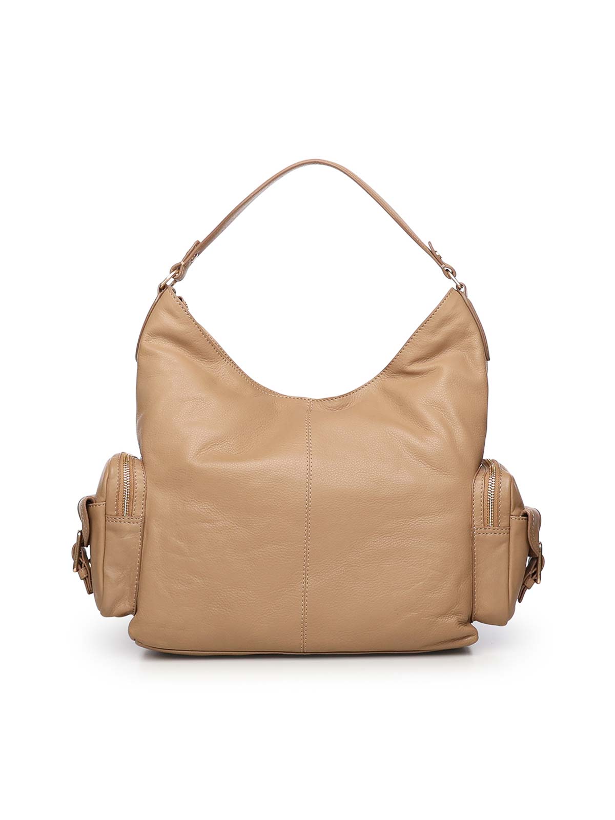 made of hammered calfskin, zip closure, metal lettering logo, adjustable and removable shoulder strap, side zip pockets with personalized buckle, dimensions: 38 x 36 x 18 cm, color: camel
