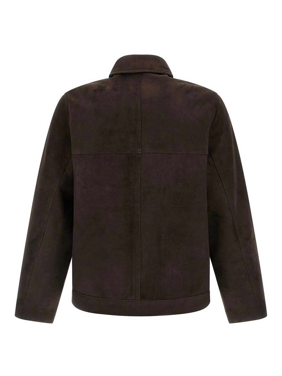 Fiore suede jacket, unlined, shirt collar, front button closure, pockets, long sleeves with cuffs.