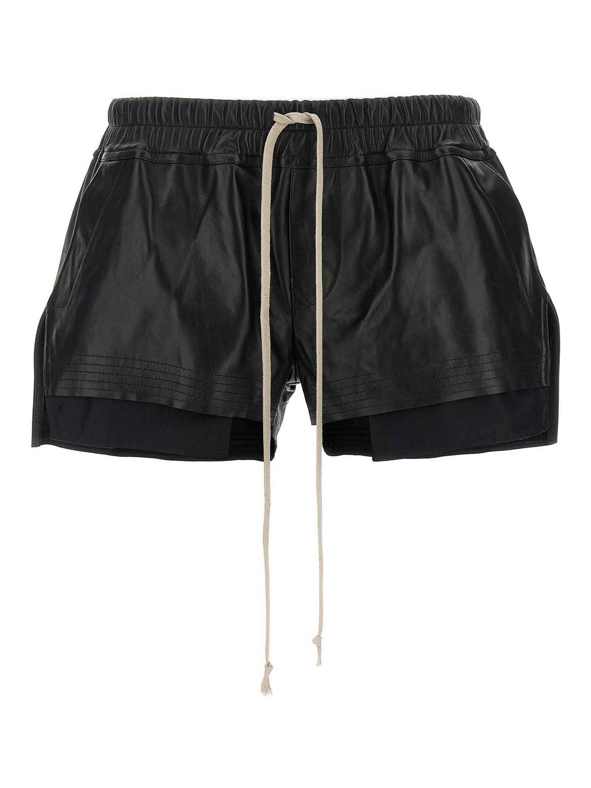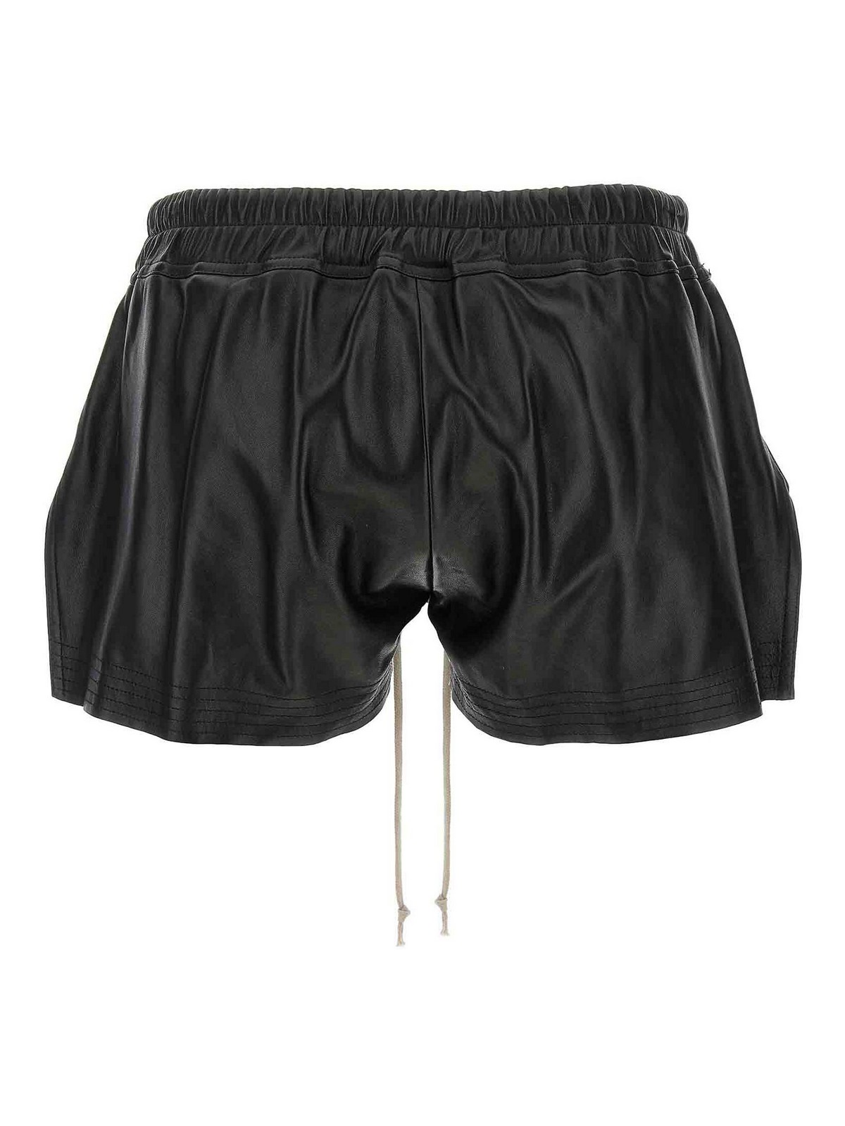 fog boxers' leather shorts with adjustable drawstring elastic at the waist, pockets with visible lining, side slits, trompe l'oeil flap.