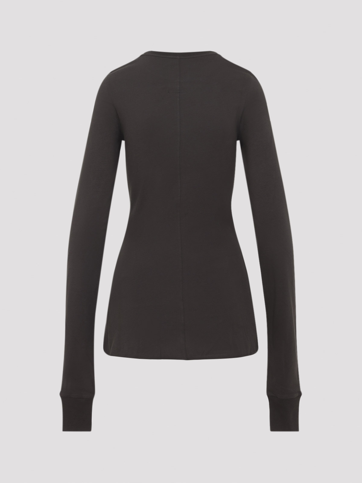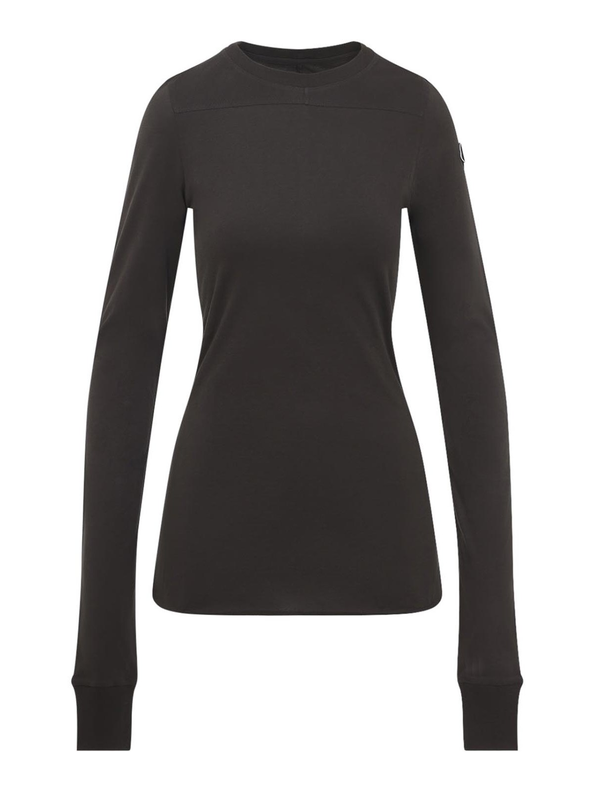 Moncler x rick owens dark dust girder ls t-shirt. dark dust.mes diumweight cotton jersey, long-sleeved and has a crewneck and a slim fit. girdered panel on the front upper chest and shoulder and has the moncler + rick owens embroidered logo patch on the left upper arm.