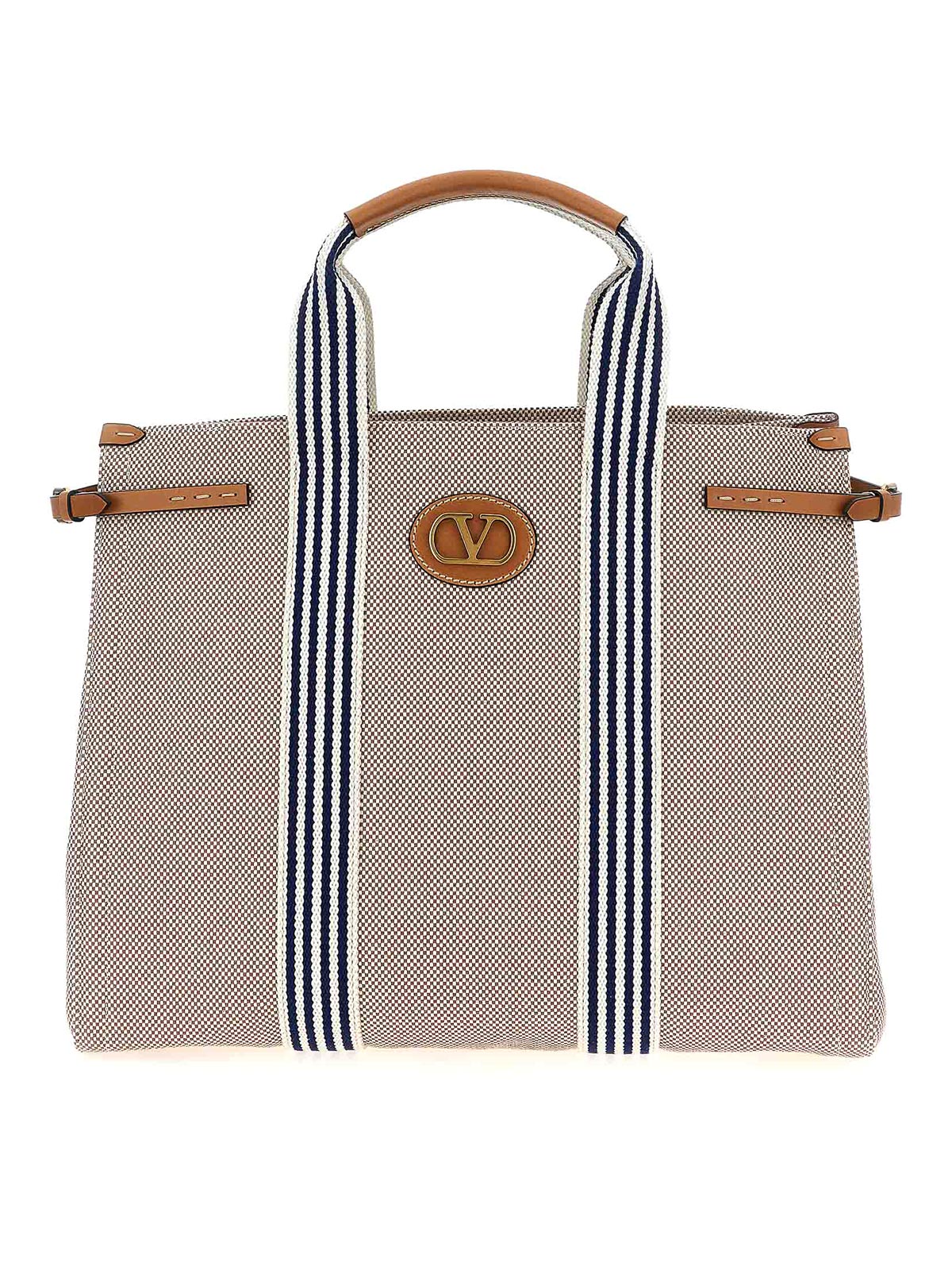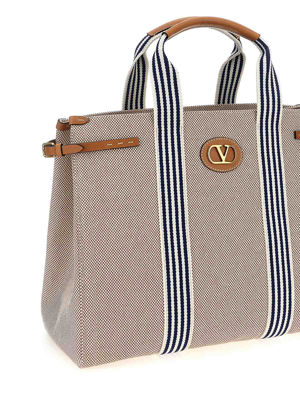antibes' canvas handbag with leather details and contrast fabric bands, leather patch with metal vlogo signature on the front, double fixed handle, metal details, adjustable side straps, magnetic closure.