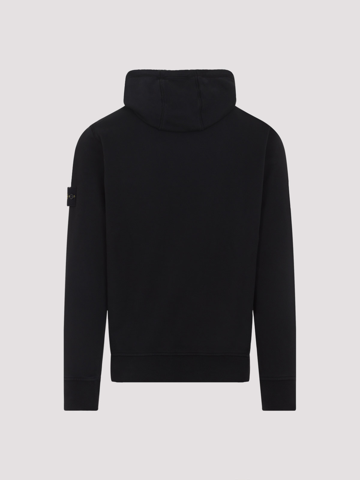 Stone island black cotton hoodie sweater. pure black cotton sweater, tonal hood, front tonal drawstring details, kangaroo pockets, long sleeves, signature patch logo on the right sleeve, ribbed cuffs and hem, straight hem.