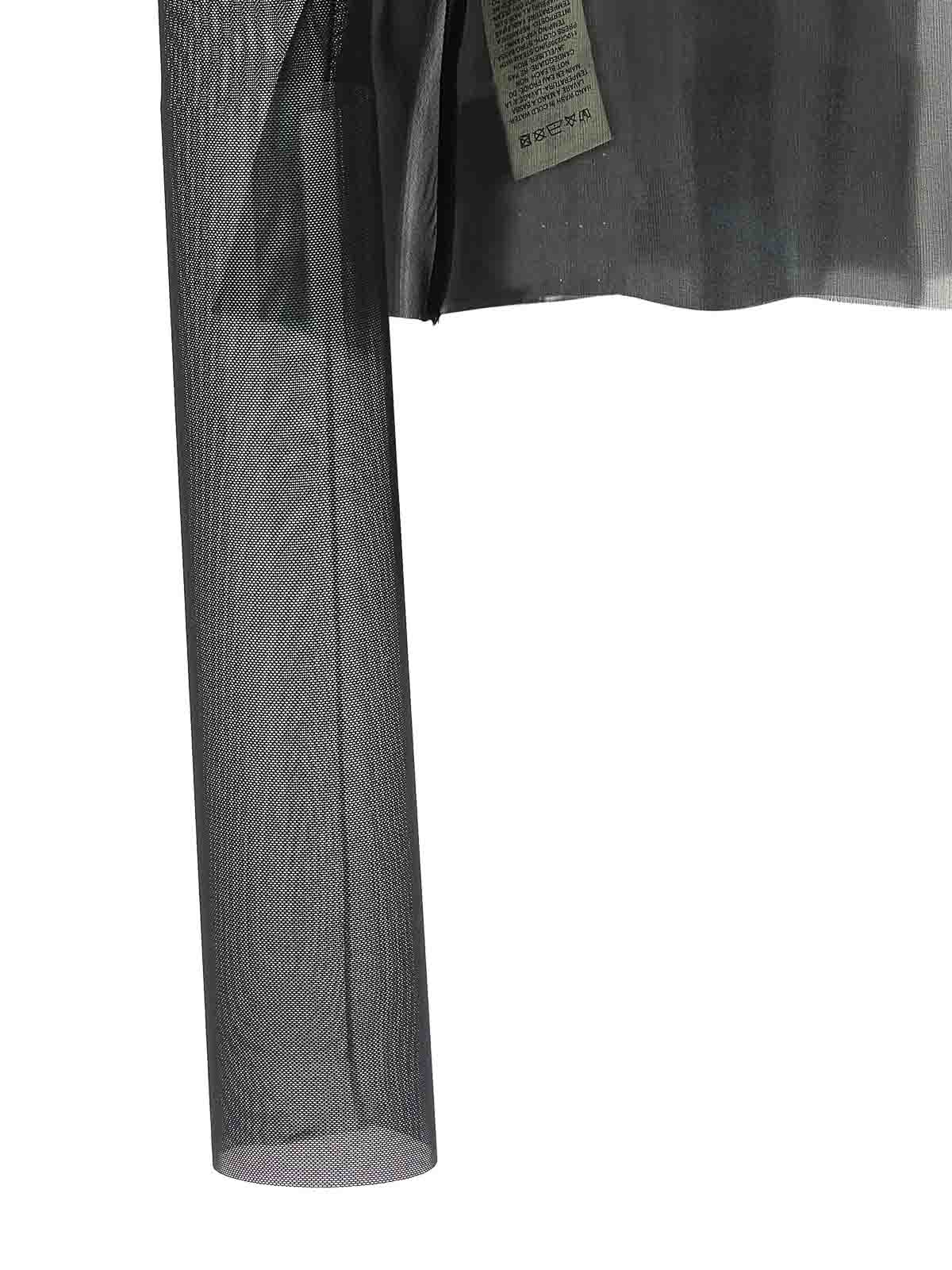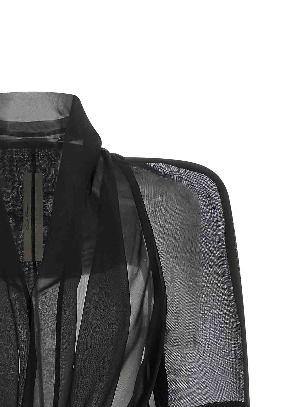 Semi-transparent 'combo metro' jacket in silk chiffon, nylon and stretch tulle sweater, rounded shoulders and meter-style structured, raw cut hem, shawl collar, elastic waistband at the back and ribbon to tie on the front, long sleeves.