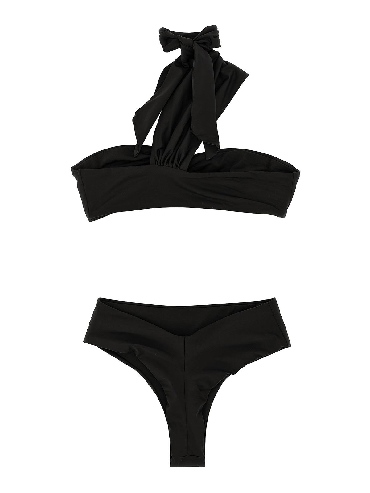 Lycra bikini, one-shoulder top with crossed band on the breast, tie to tie behind the neck with metal jewel detail with hammered texture, high waist bottoms.