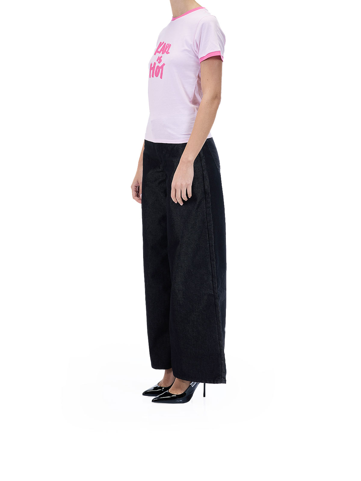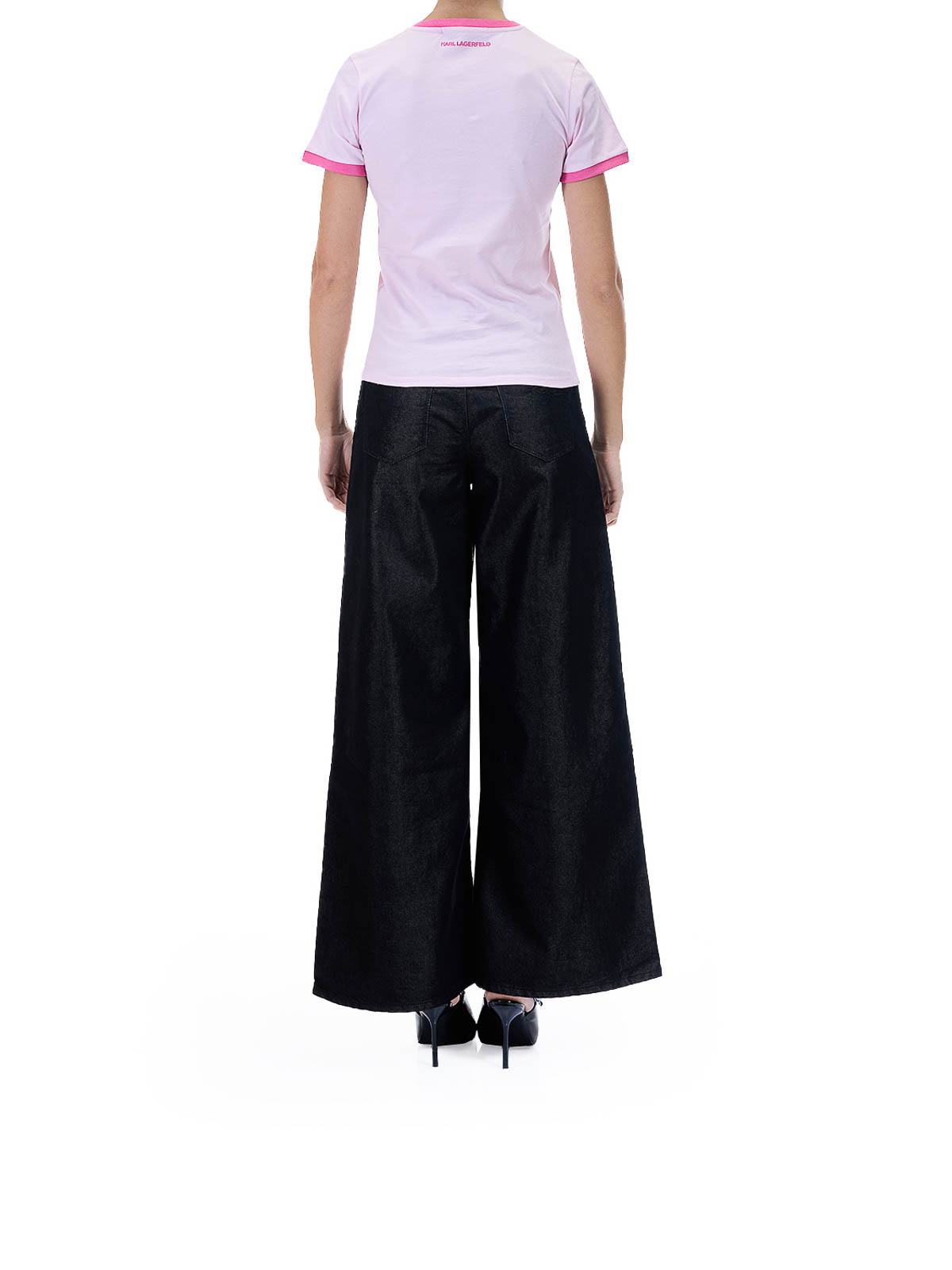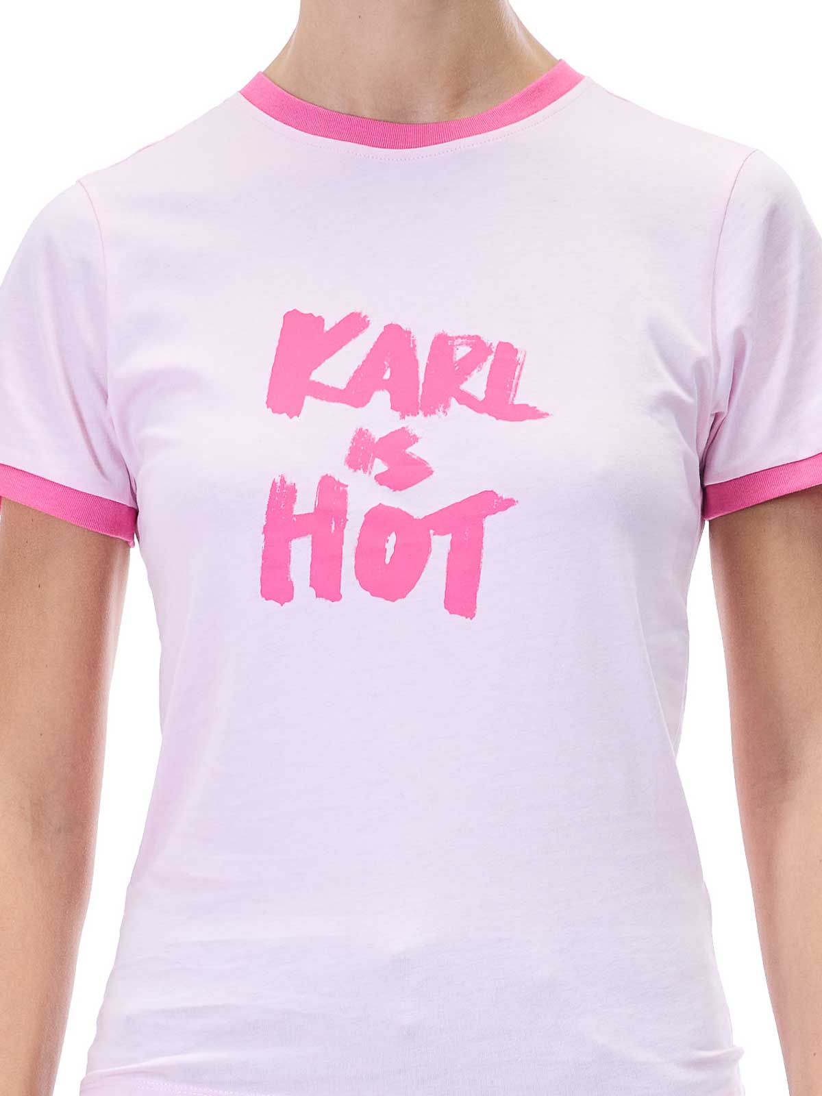 Karl is Hot T-shirt in pink. Cotton T-shirt by Karl Lagerfeld in collaboration with Paris Hilton, featuring a Karl is Hot print on the front and contrasting trim, short sleeves, a Karl is Hot slogan print, contrasting trim, a ribbed crew neck, and a Karl Lagerfeld logo on the back. Color: pink, 100% cotton, regular fit. Made in Portugal.