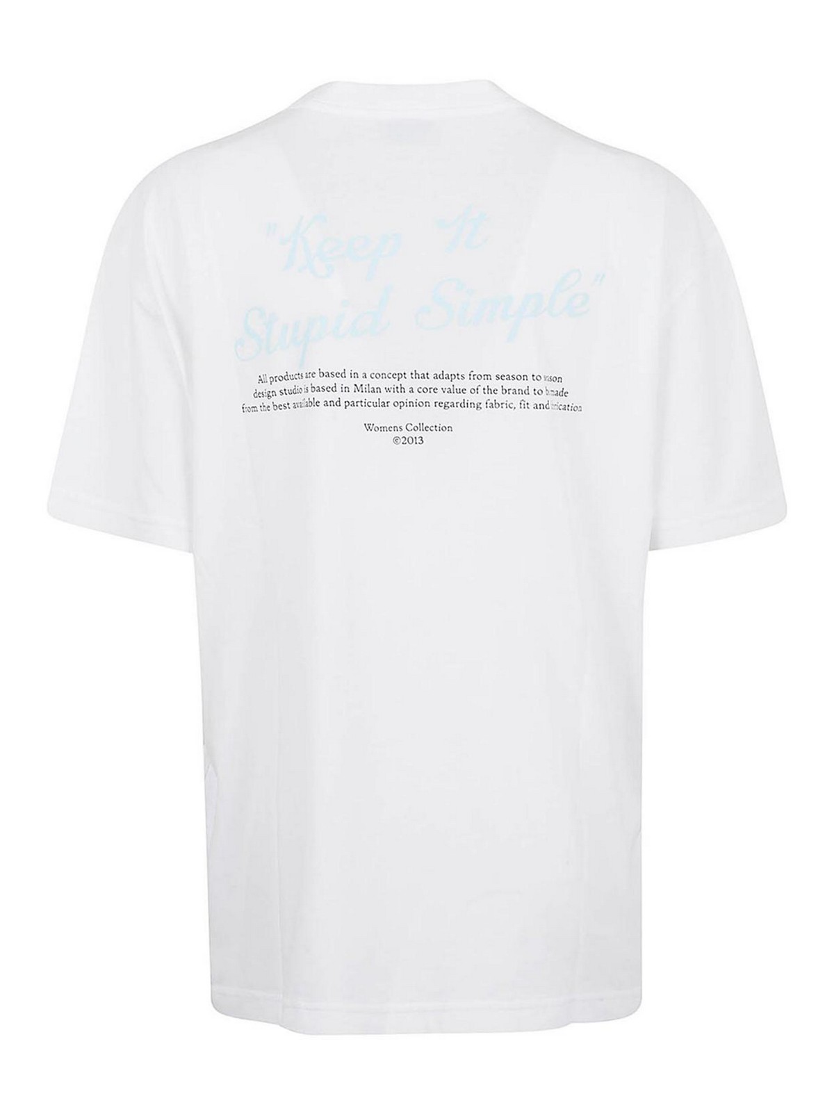Pure cotton T-shirt from off white. half sleeve, crew neck, regular fit design. characterized by front print k.i.s.s. and contrasting print on the back.