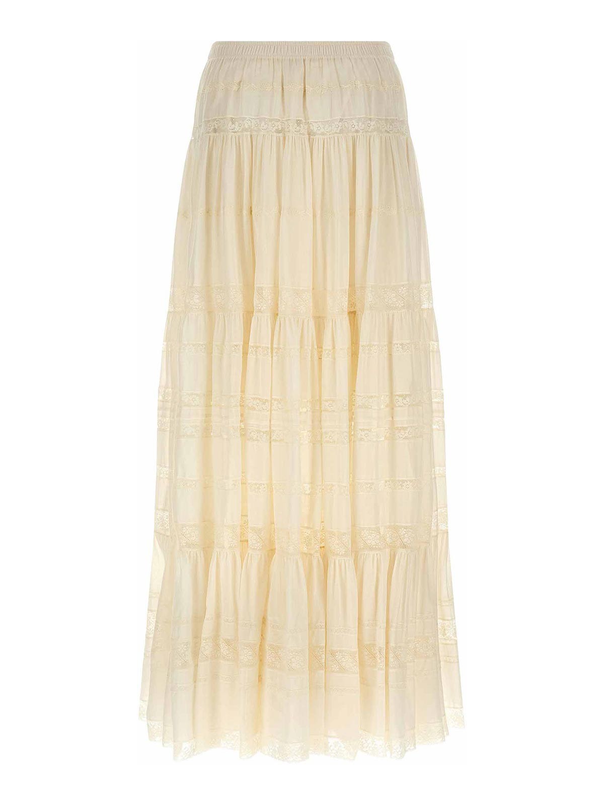 Long skirt in light cotton with lace inserts tone on tone effect i do not see, flounced model, elastic waistband, underskirt.