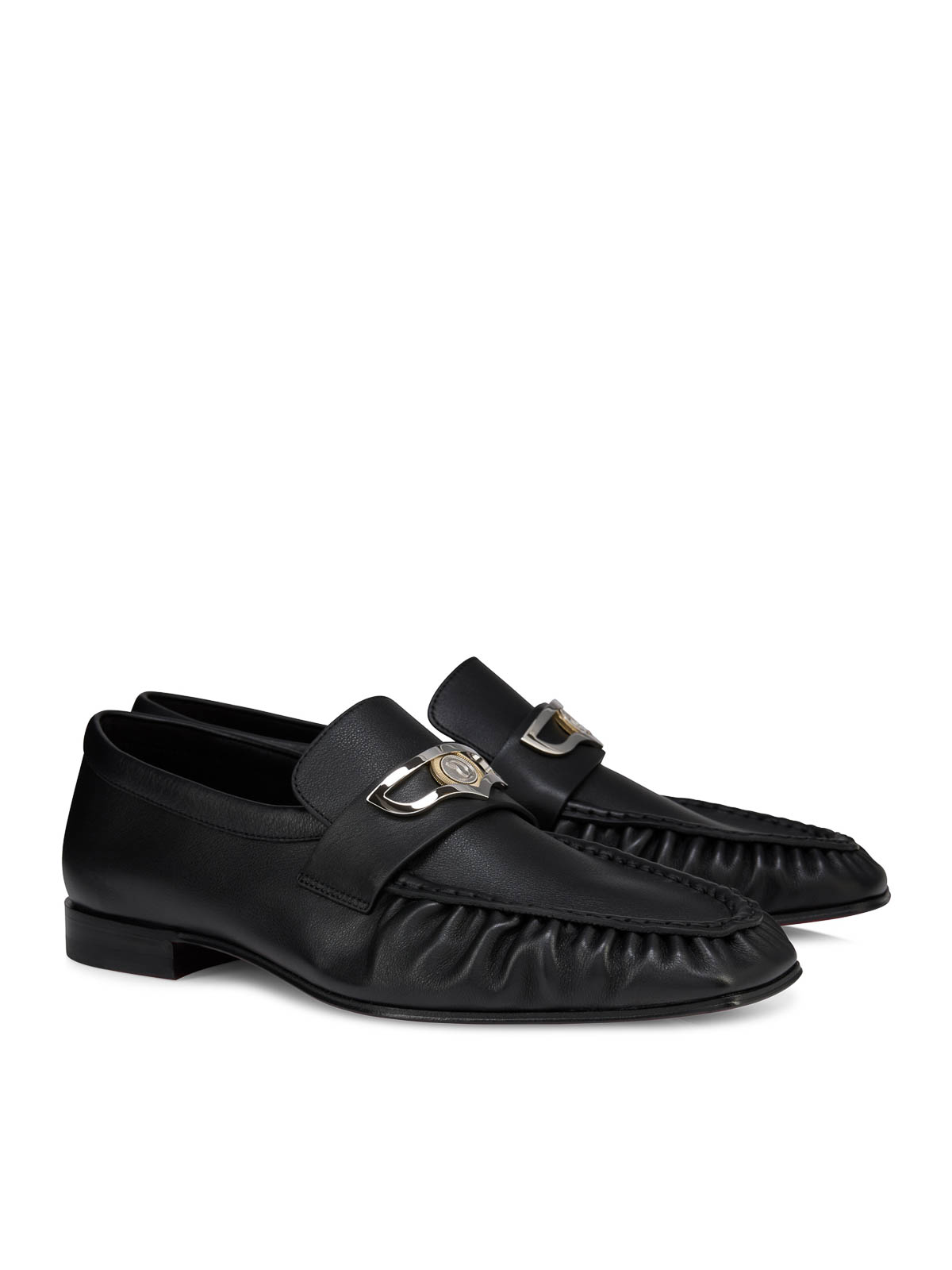 Tongue adorned with a bar coin embossed with the maison`s logo shiny black square toe pleated effect color black
