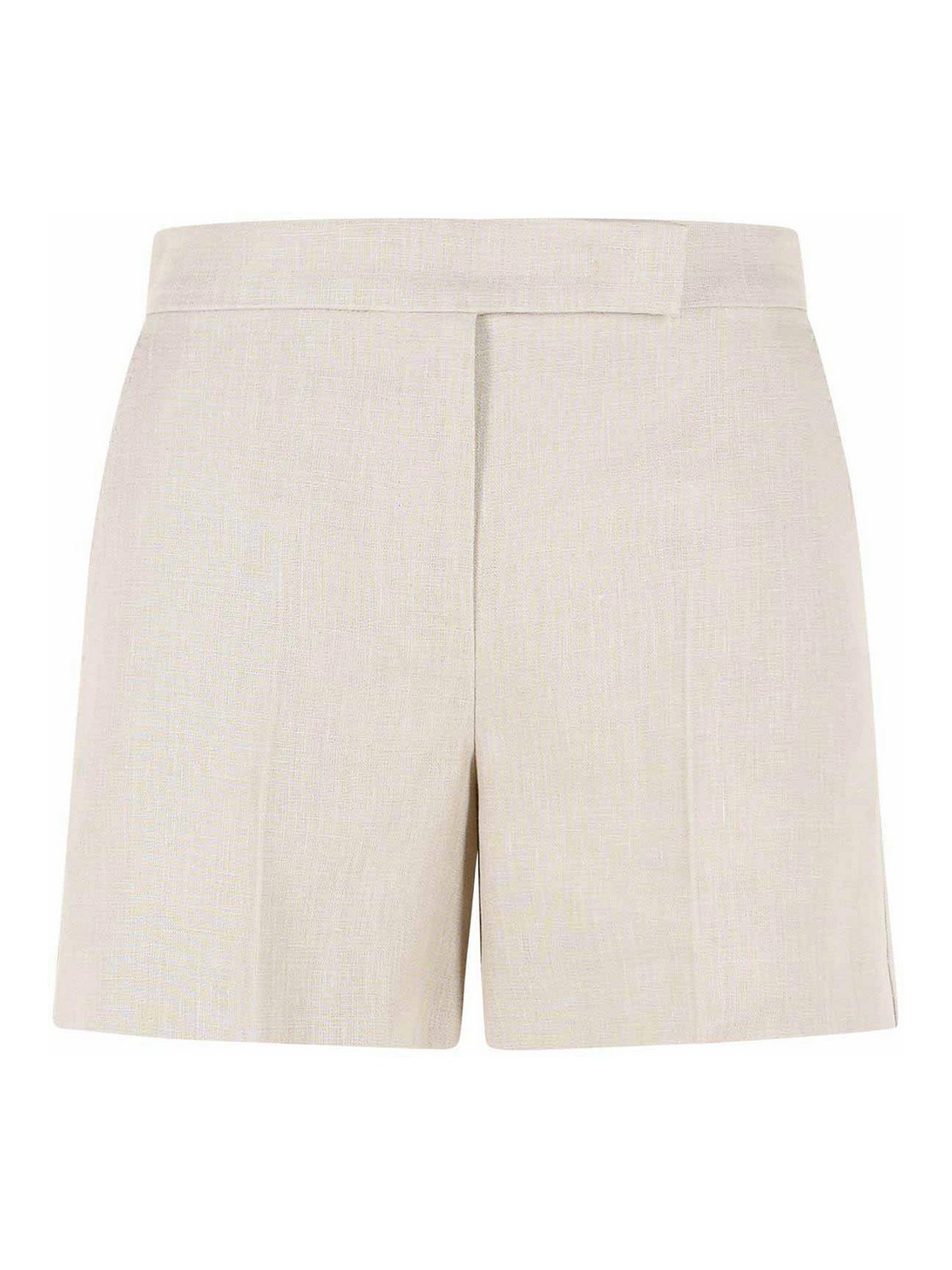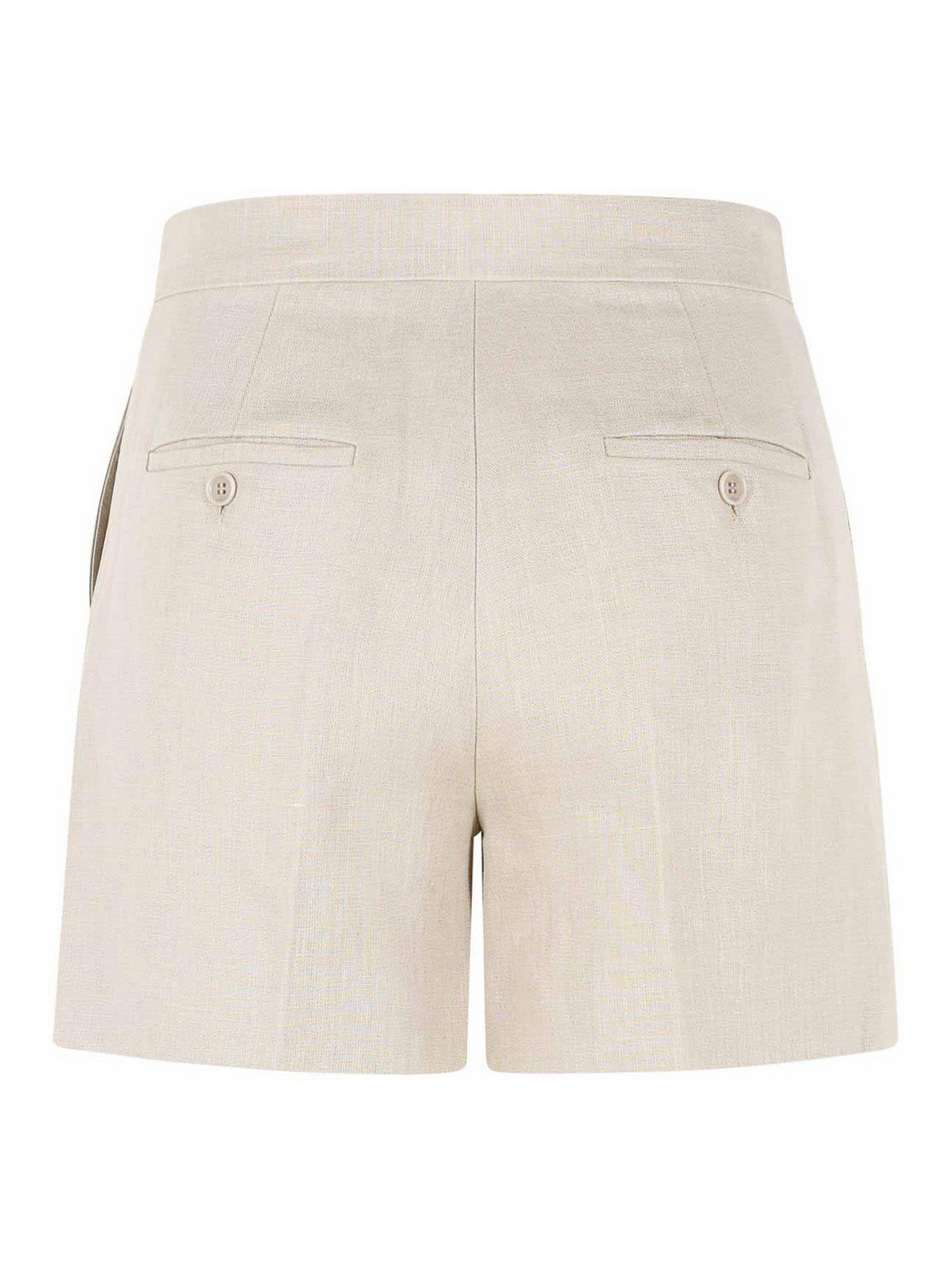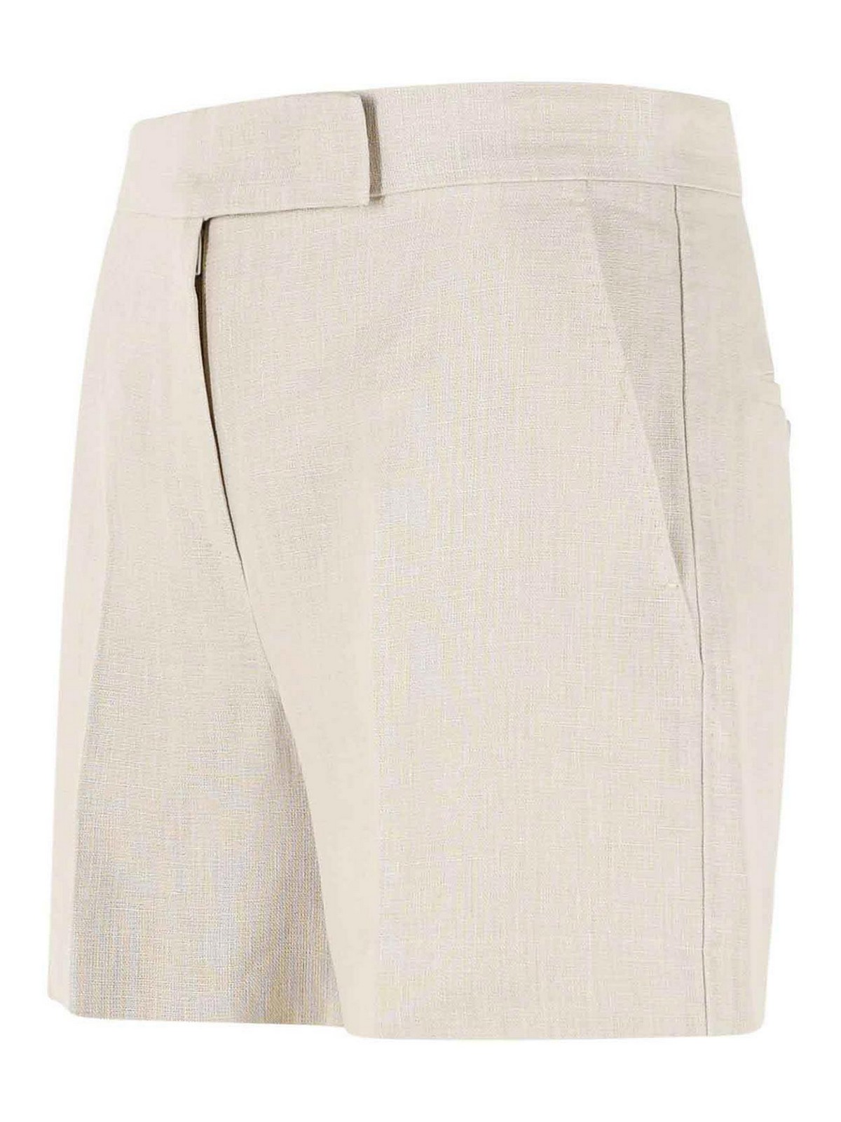 Regular fit, shorts in pure linen double mat, high waist strip closure, flap and hook zip, french pockets on the sides, horizontal welt pockets with button on the back, stretched pleat, stretch fabric lining