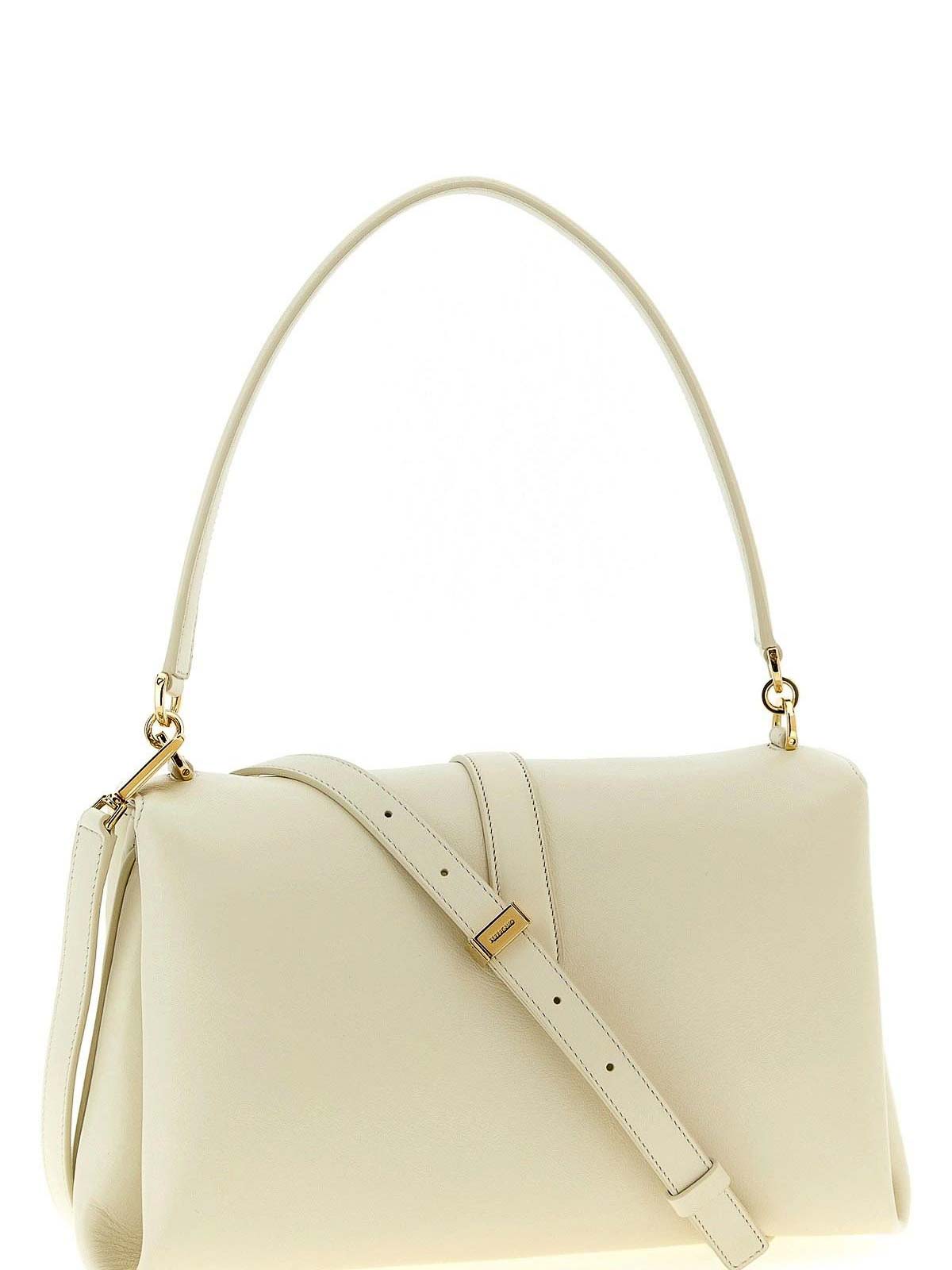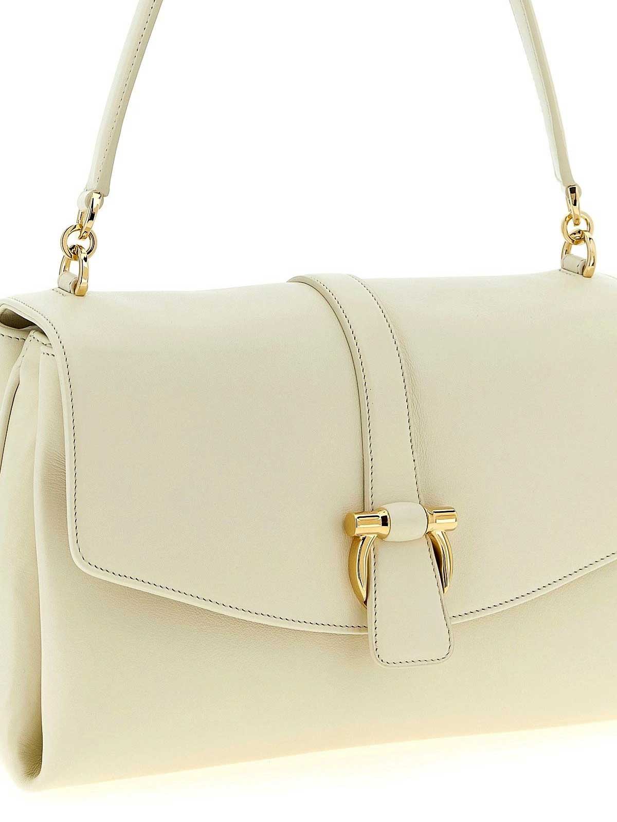designer color: limoges mascarpone, calf leather exterior, magnetic flap closure, gancini detail, side gussets, fixed top handle, adjustable removable strap, shoulder bag style