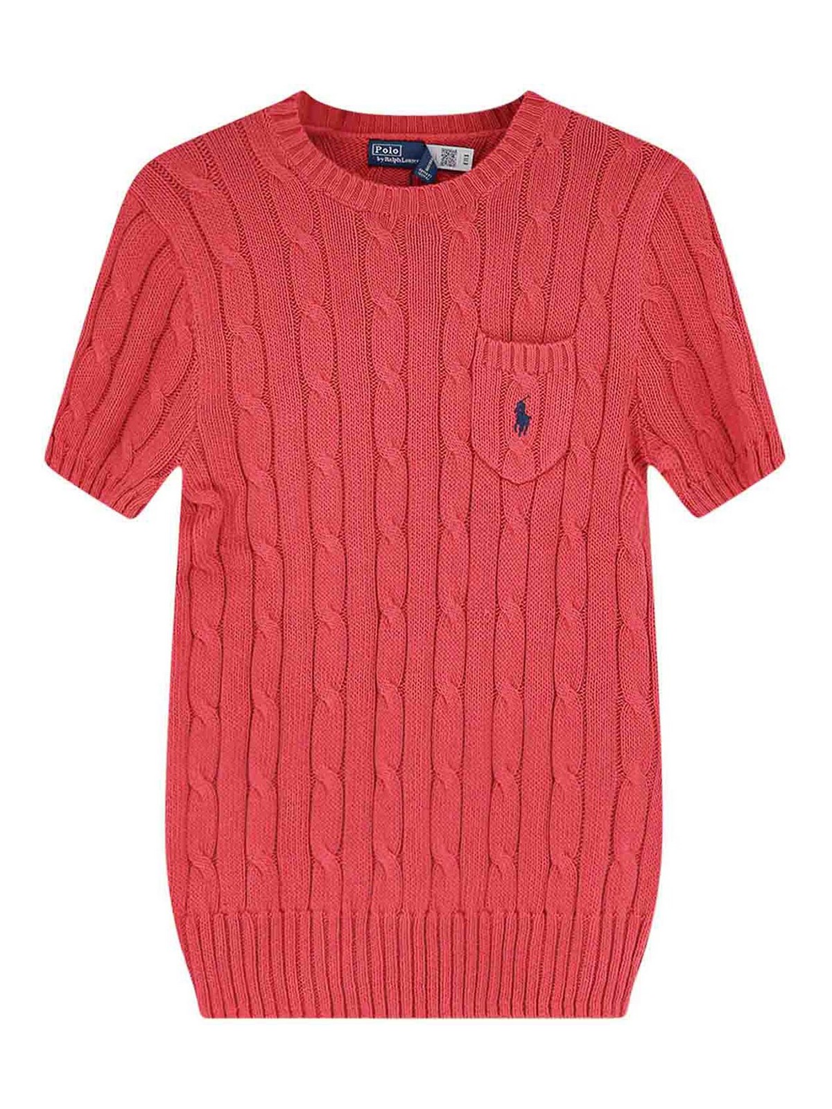 Crew neck, short sleeves, cable knit, one patch pocket, 100% cotton.
