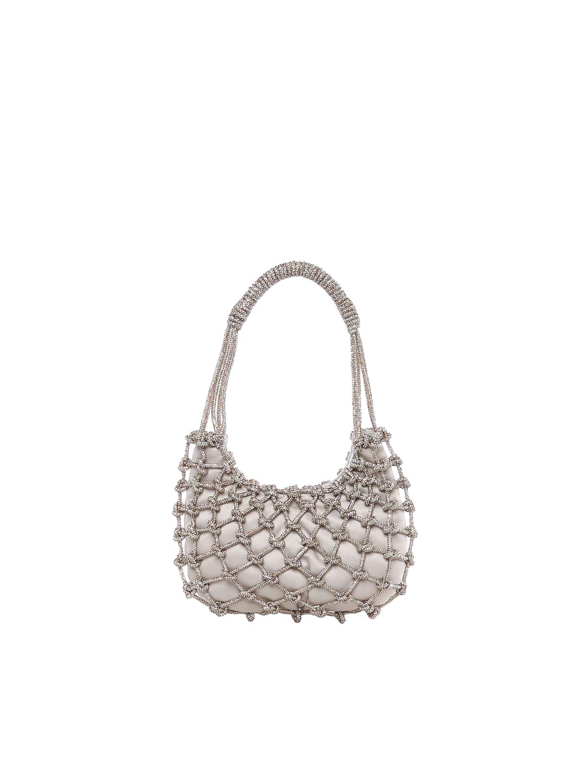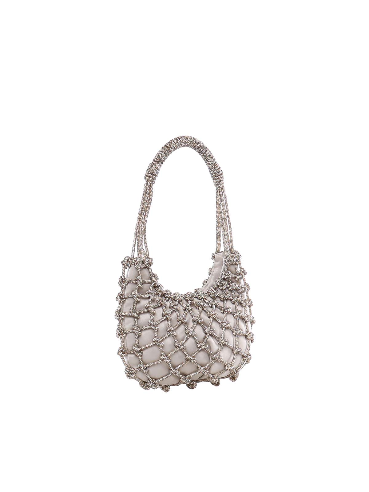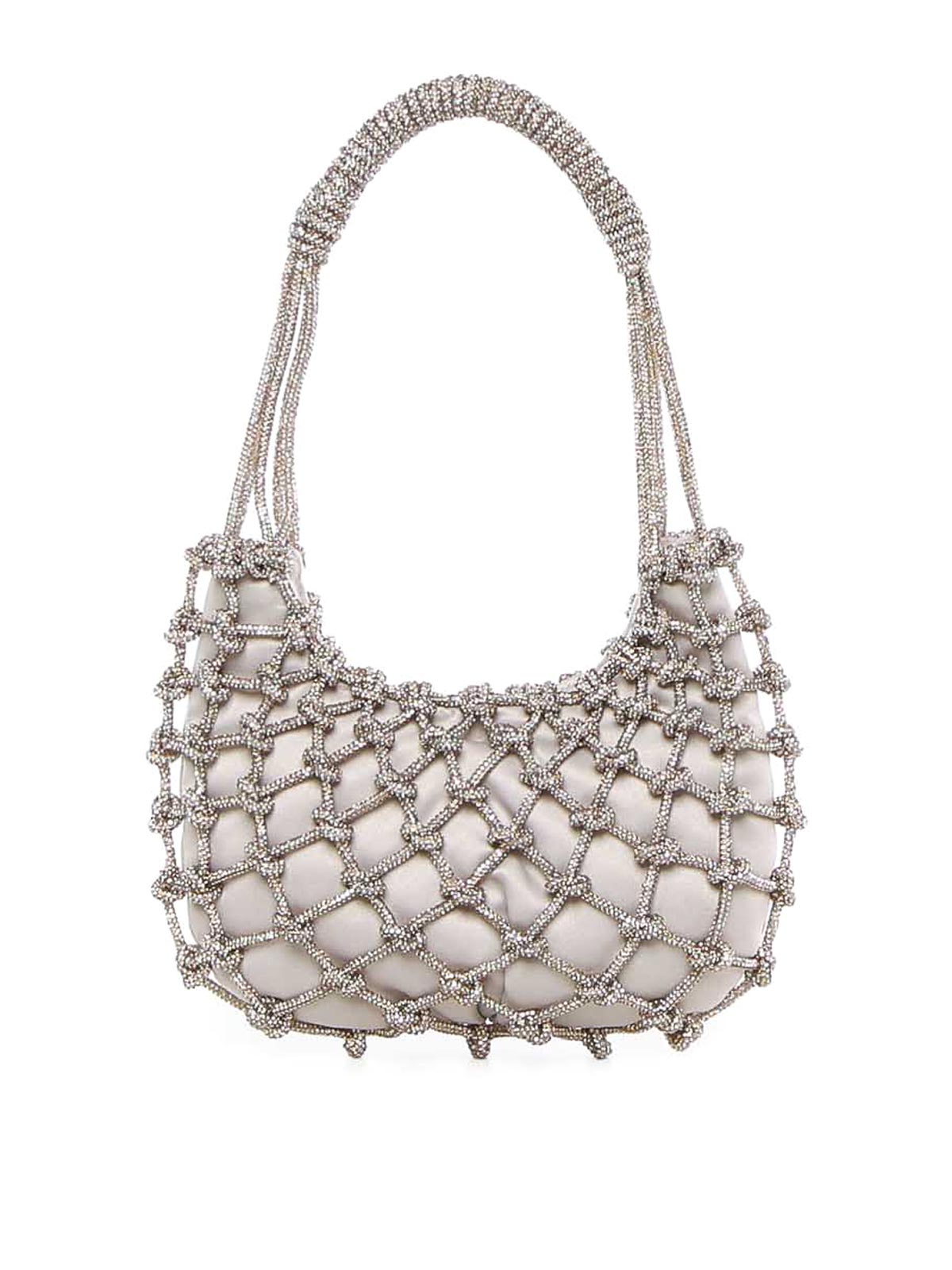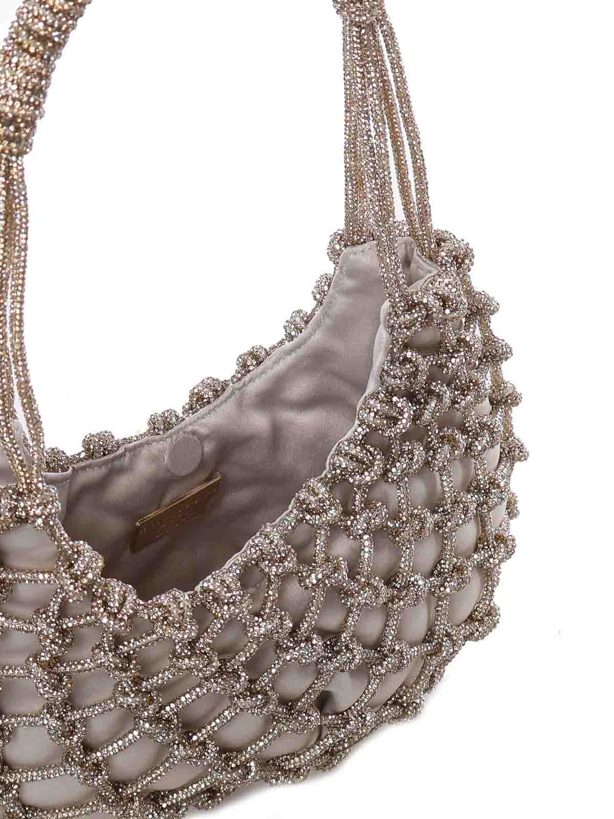 made ofsatin and crystals, magnetic closure, satin lining, dimensions: 20 x 12 x 5 cm, made in italy, designer color: champagne grey