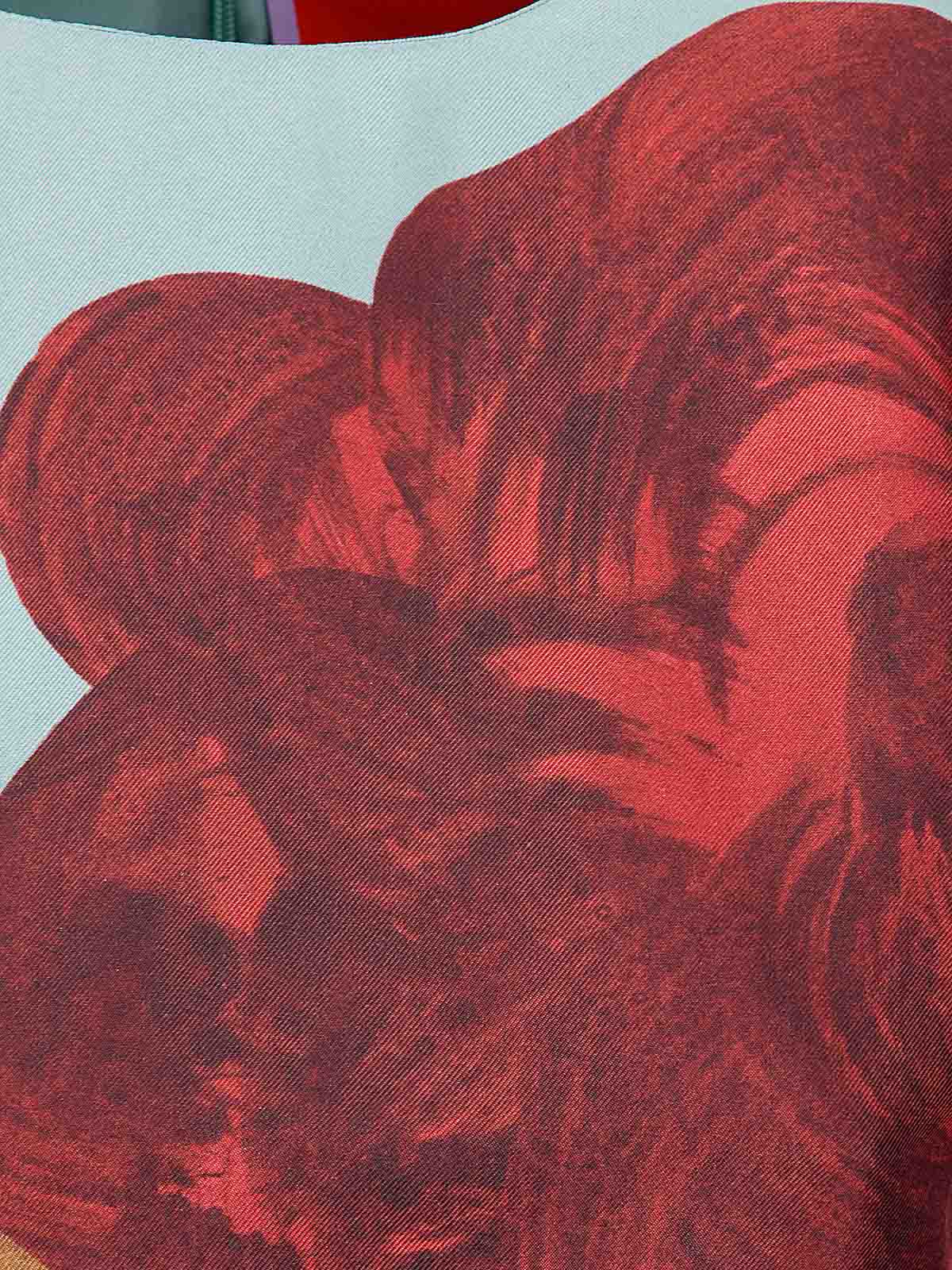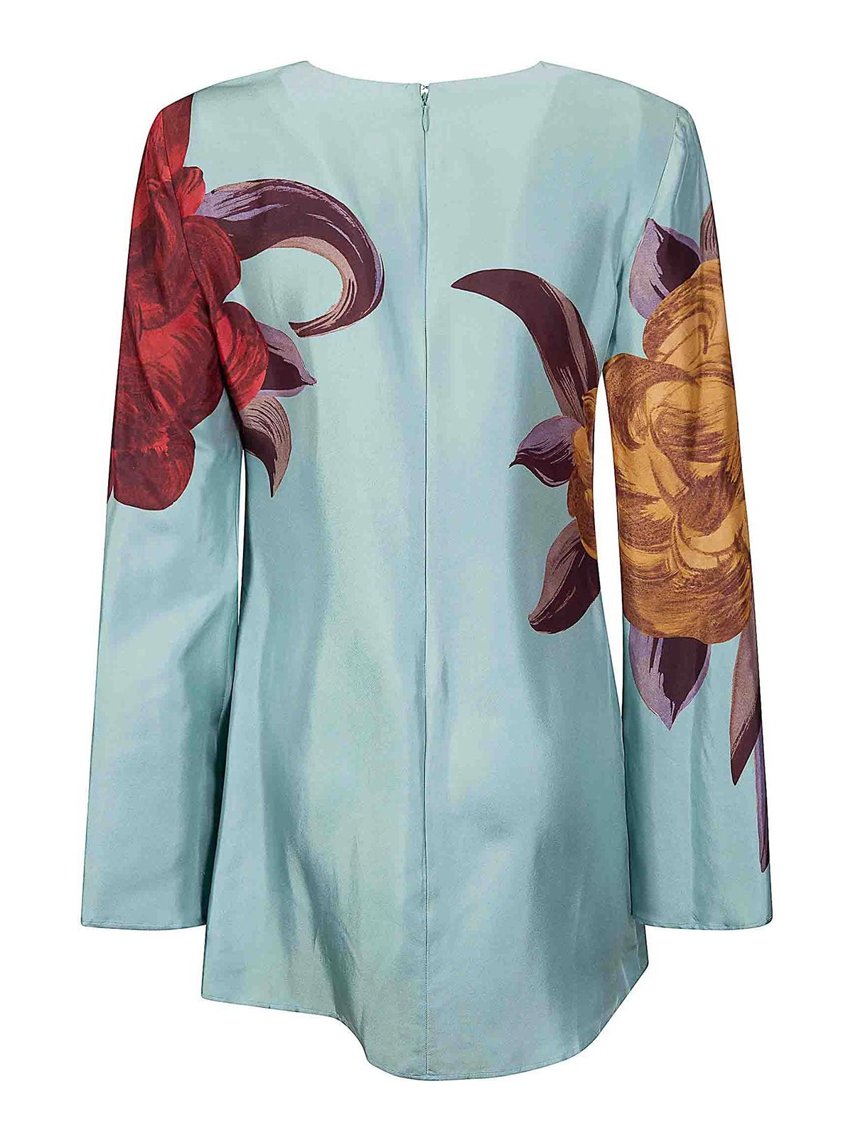 Short silk dress with maxi floral print, rear zip closure, long slightly flared sleeves.