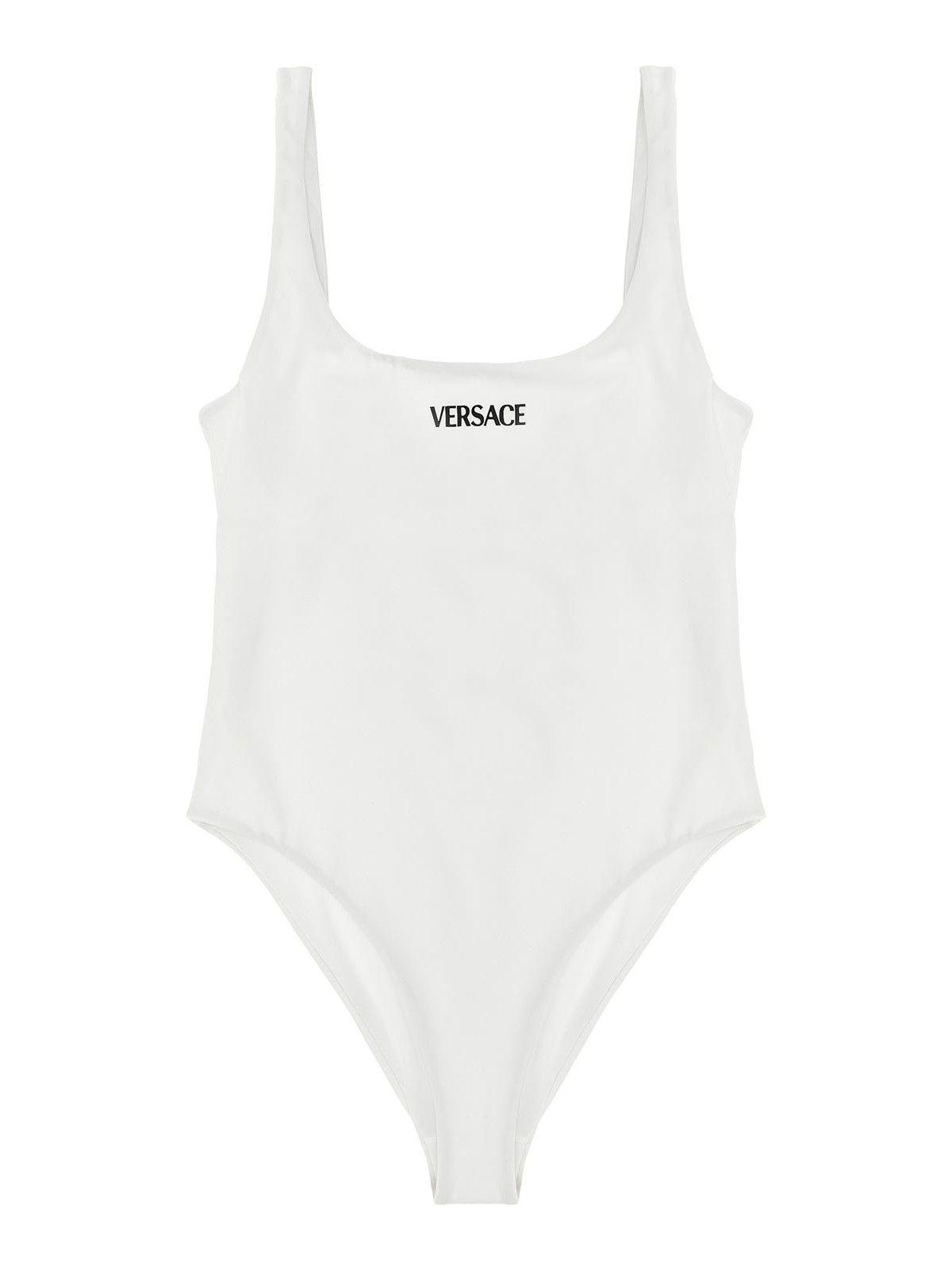 Lycra one-piece swimsuit, rubber 'versace logo' at the front, round neckline at the front, wide round neckline at the back.