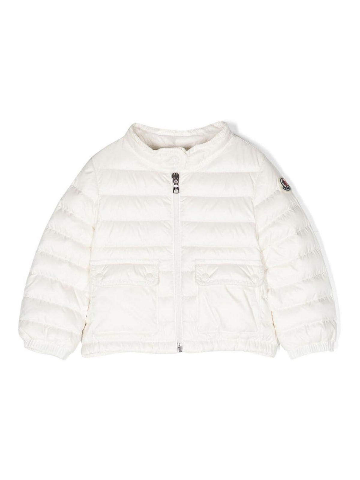 White, quilted padded design logo patch at the mock neck throat latch zip long sleeves with elasticated cuffs two stud, pockets elasticated hem full