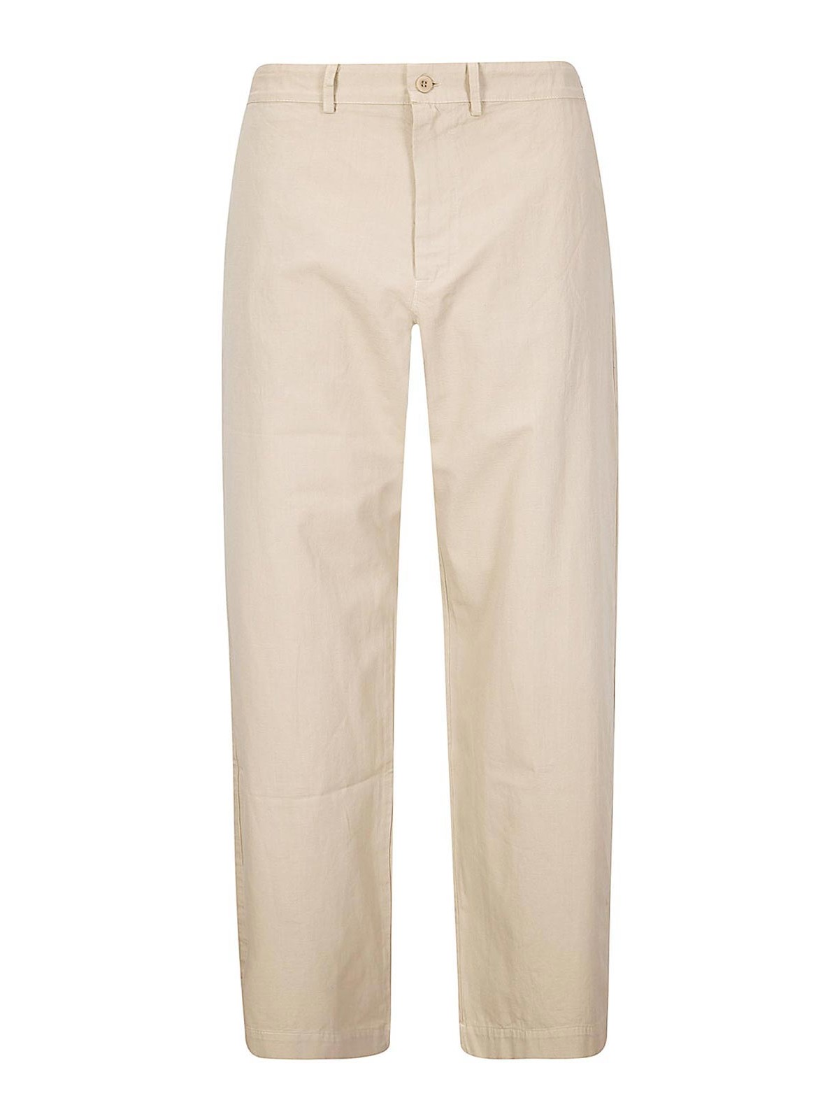Trousers in rough and light cotton, chino model, straight leg, side pockets, classic closure.
