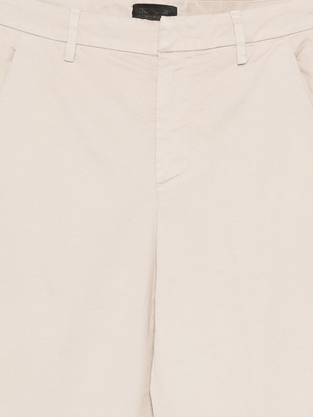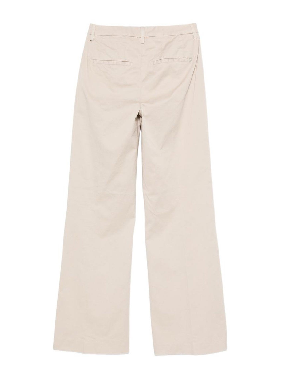 Light beige belt loops front slant pockets back welt pockets flared hem