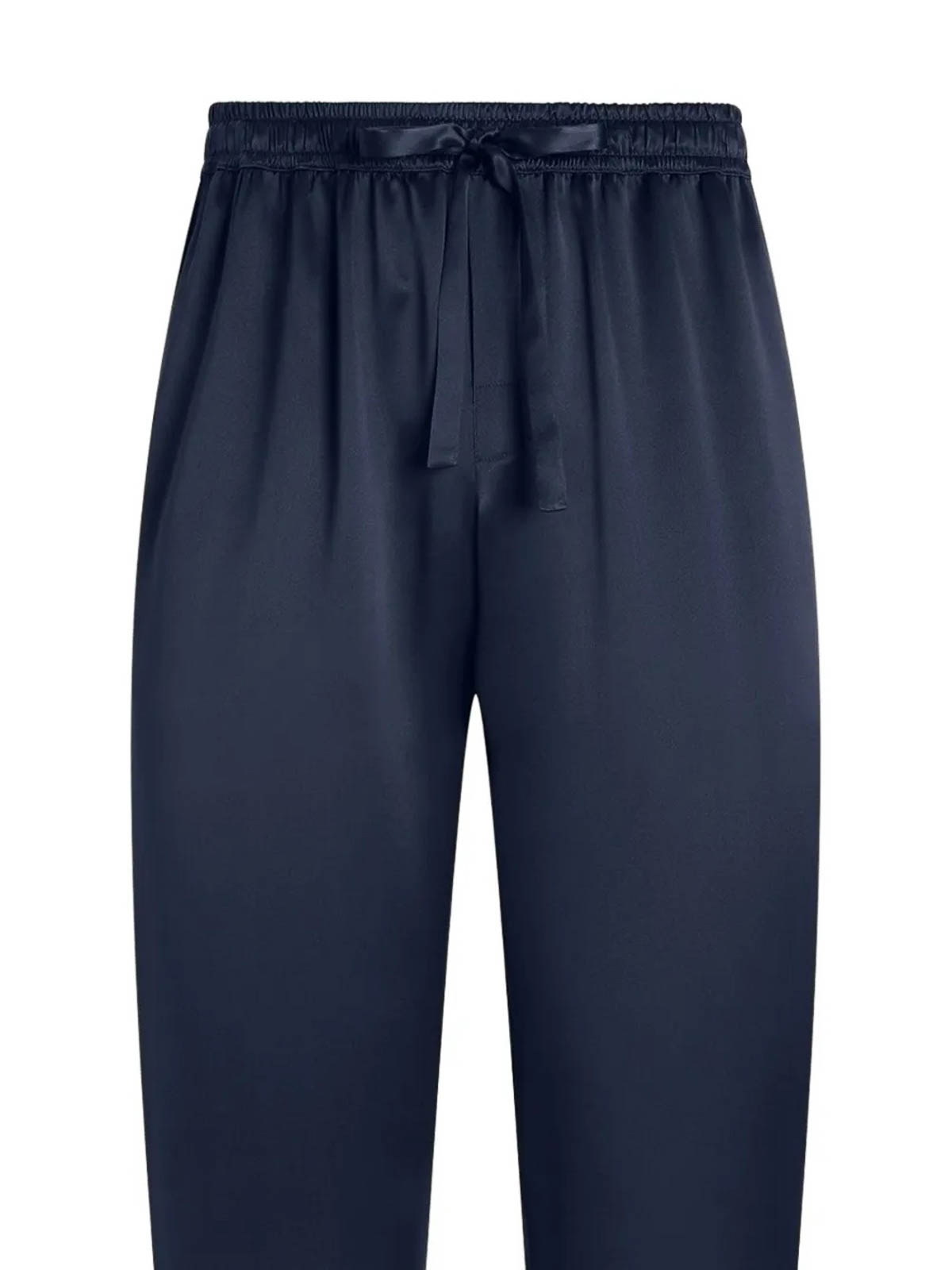 designer color: very dark blue, silk, elasticated drawstring waistband, two side inset pockets, rear patch pocket, straight leg