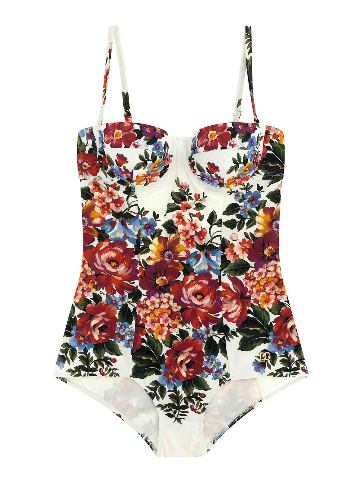 re-edition 2000' lycra one-piece swimsuit with all-over flower print, balcony style with padded cups and underwire, back hook closure with cut-out, thin adjustable and removable straps, back metal logo. the differences in print placement you might find on this product is a characteristic of dolce&gabbana's handmade products. a peculiarity that makes each garment or accessory unique and exclusive.