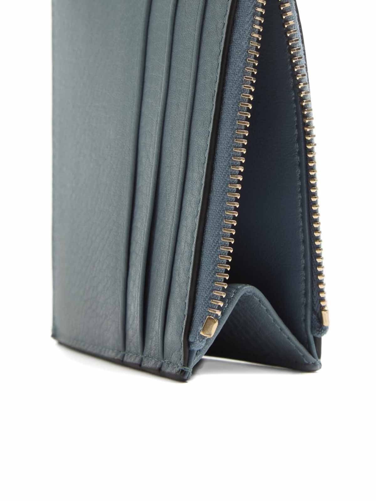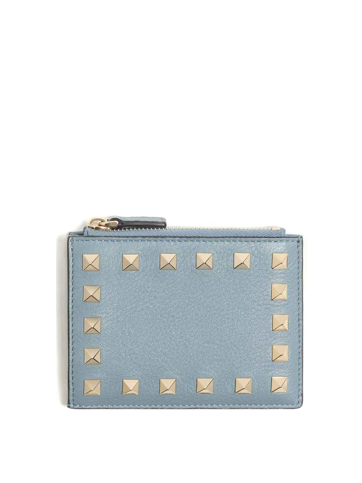 Valentino card holder light blue platinum-finish studs and hardware expandable coin compartment gold-tone studs top zip closure six card slots the full look includes valentino garavani accessories.