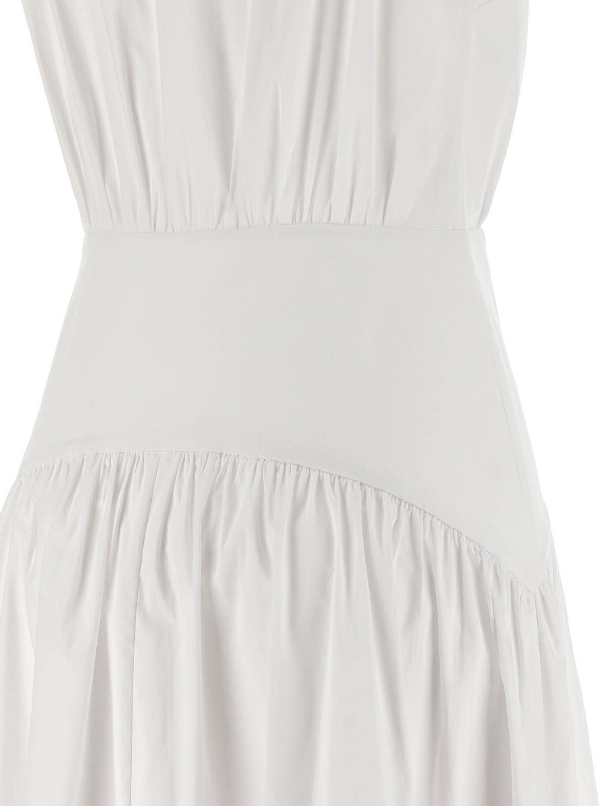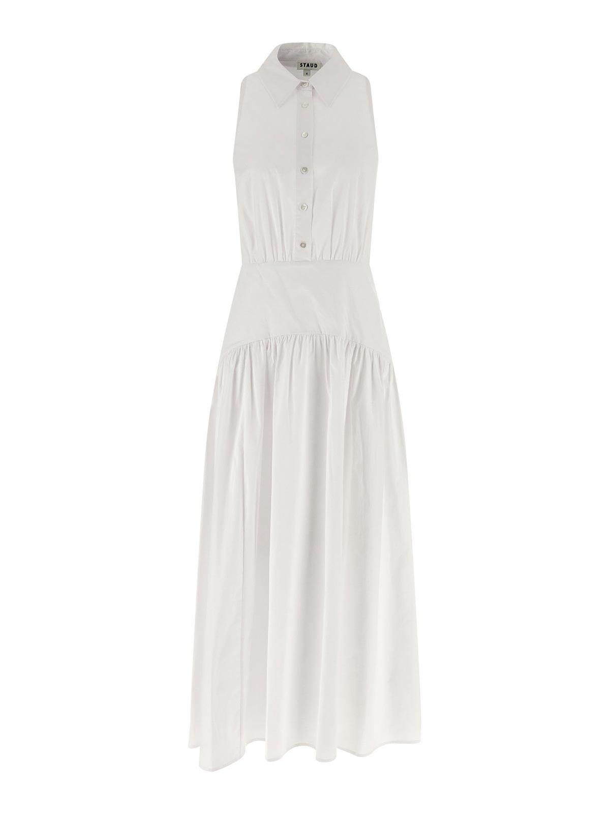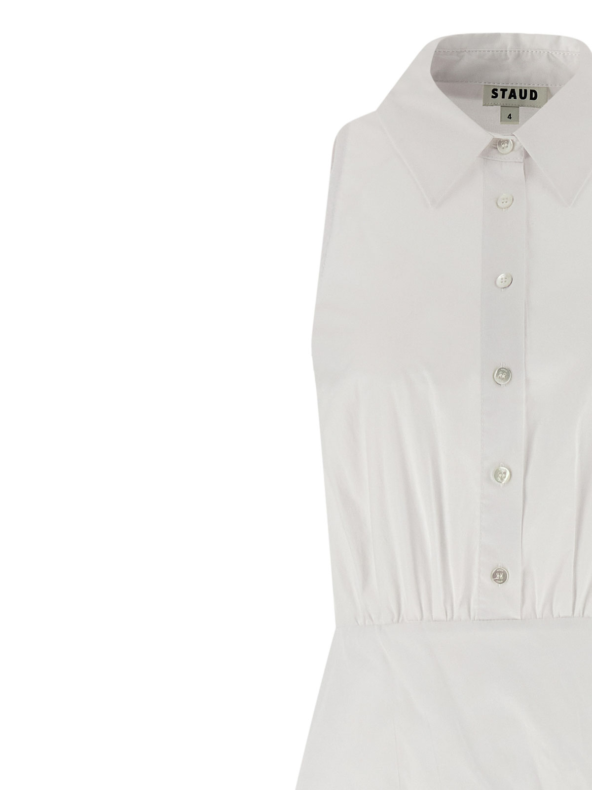 romy' dress in cotton poplin, chemisier model, collar, front button closure, wrinkled at the waist with wide skirt, sleeveless.