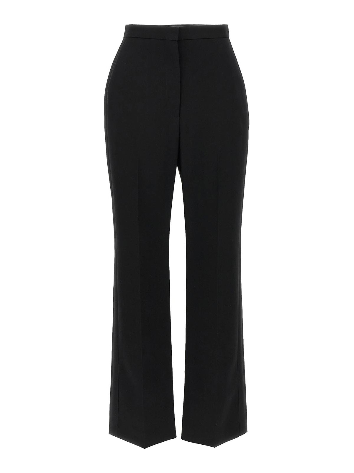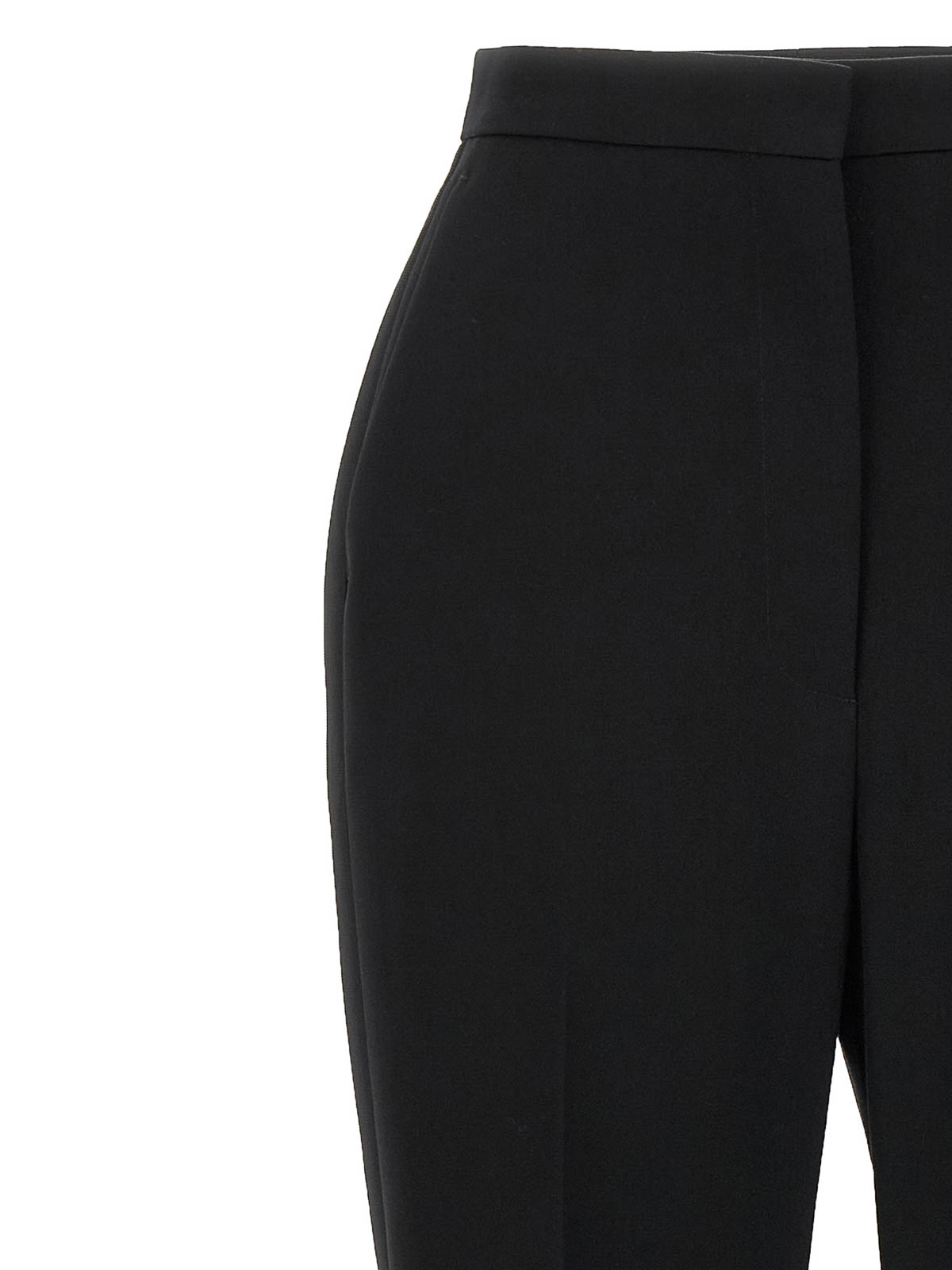 Cigarette pants in grain de poudre wool with side satin bands, straight leg, stretched crease, zip hook and front button closure, pockets.