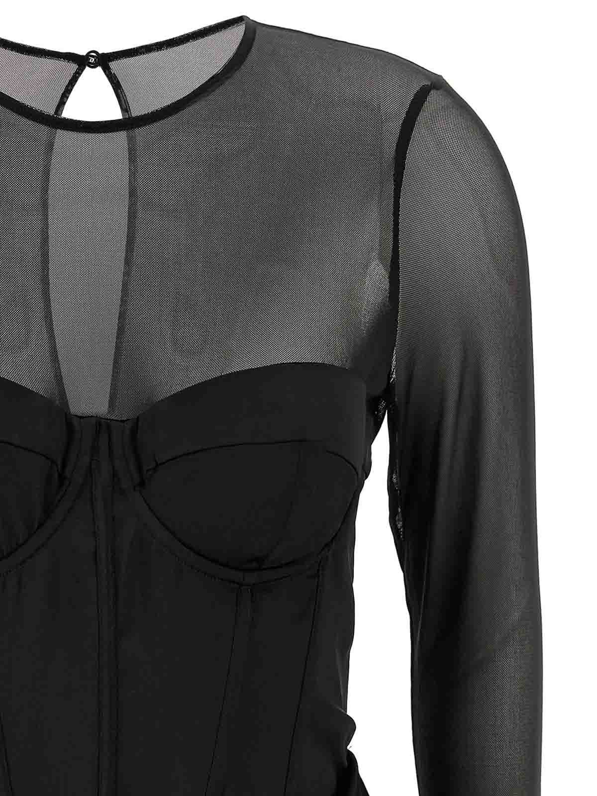 satin corset mini' dress consisting of semi-transparent mesh top and satin bottom, round neckline with back button closure and wide teardrop cut-out, long sleeves, corset construction partially attached to the skirt, preformed cups, splints, front and back draping, back zip closure.
