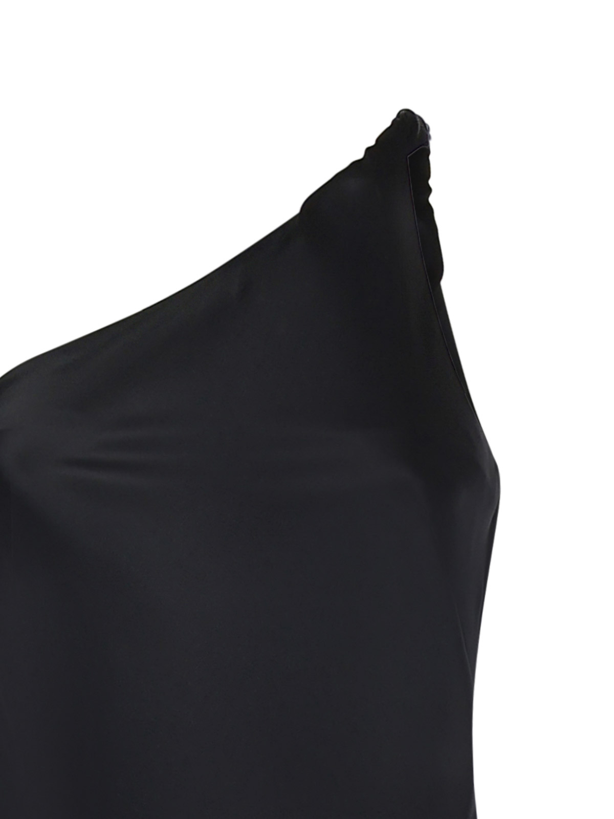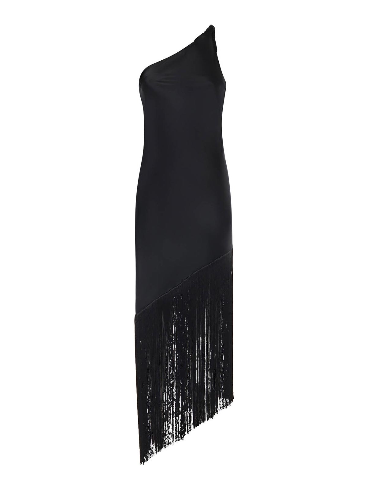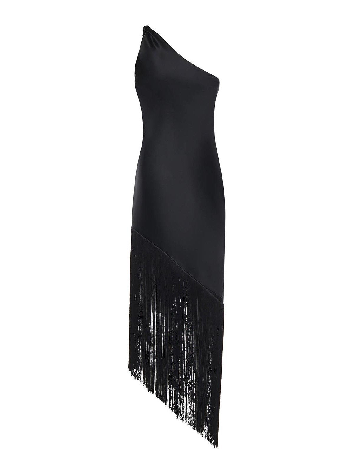 made of satin, one shoulder, fringed hem, side zip closure, size shown is 38, color: black