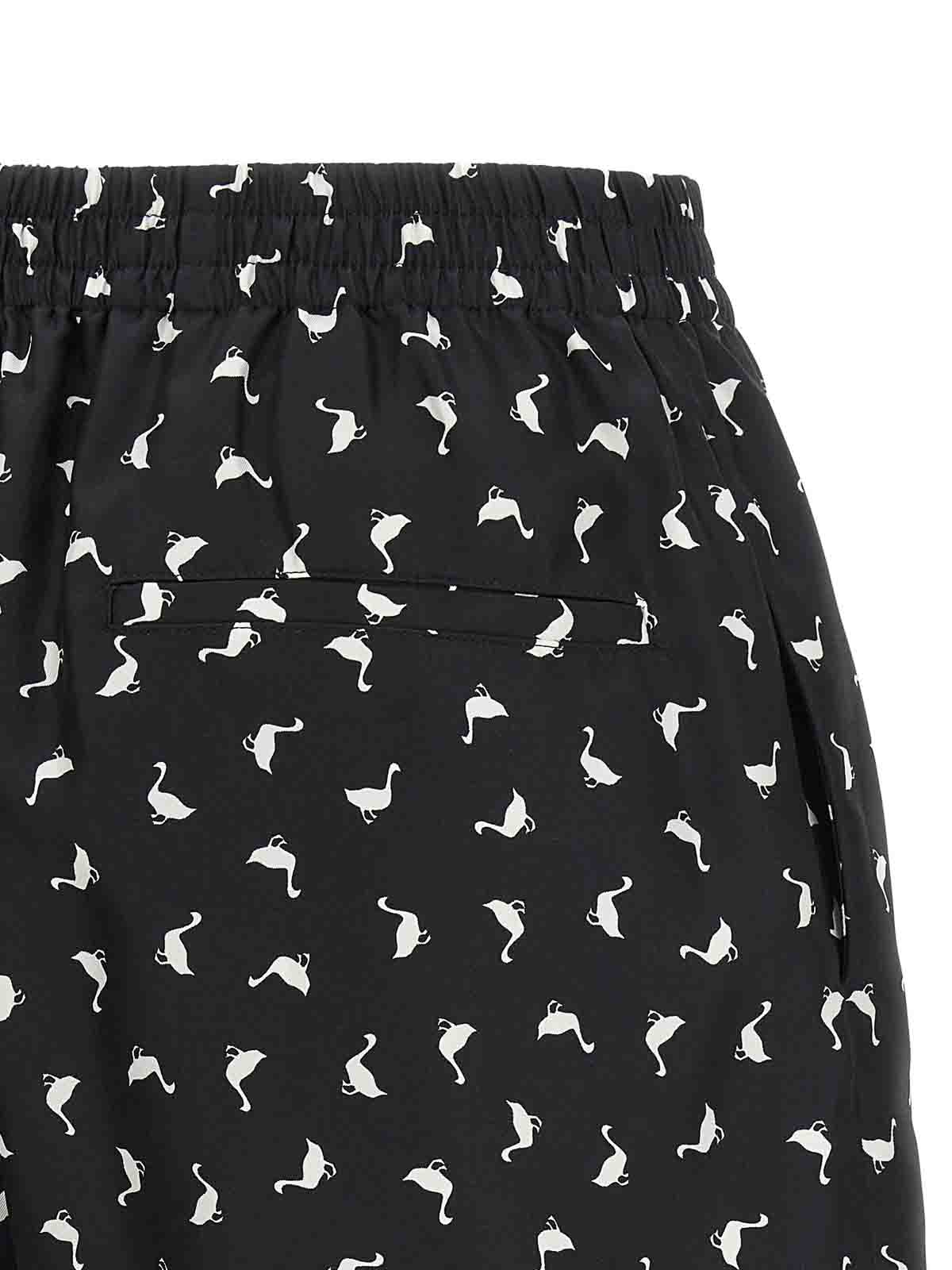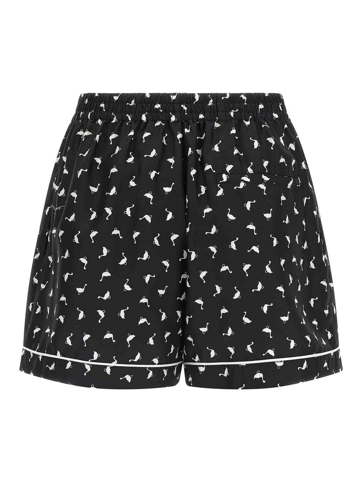 Silk twill shorts with all-over 'oche' print, elastic waistband with button, trompe l'oeil flap, pockets.