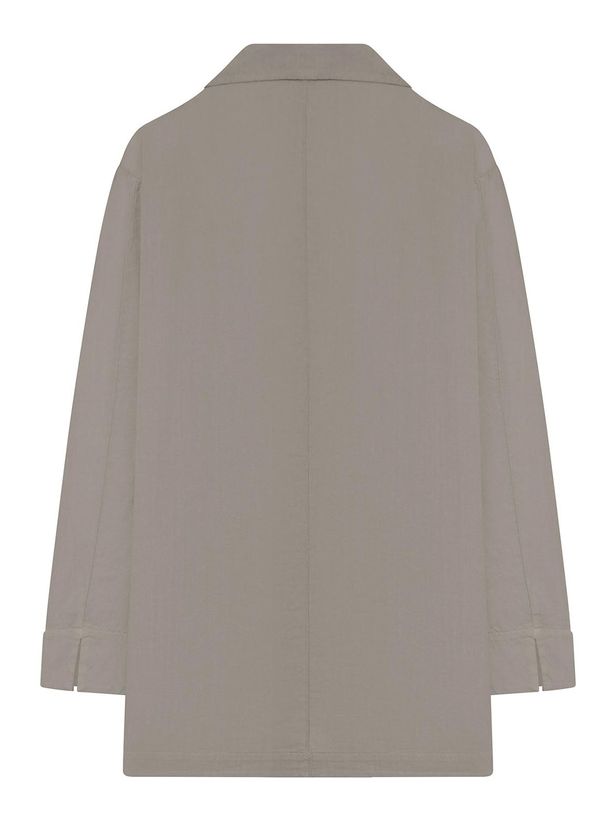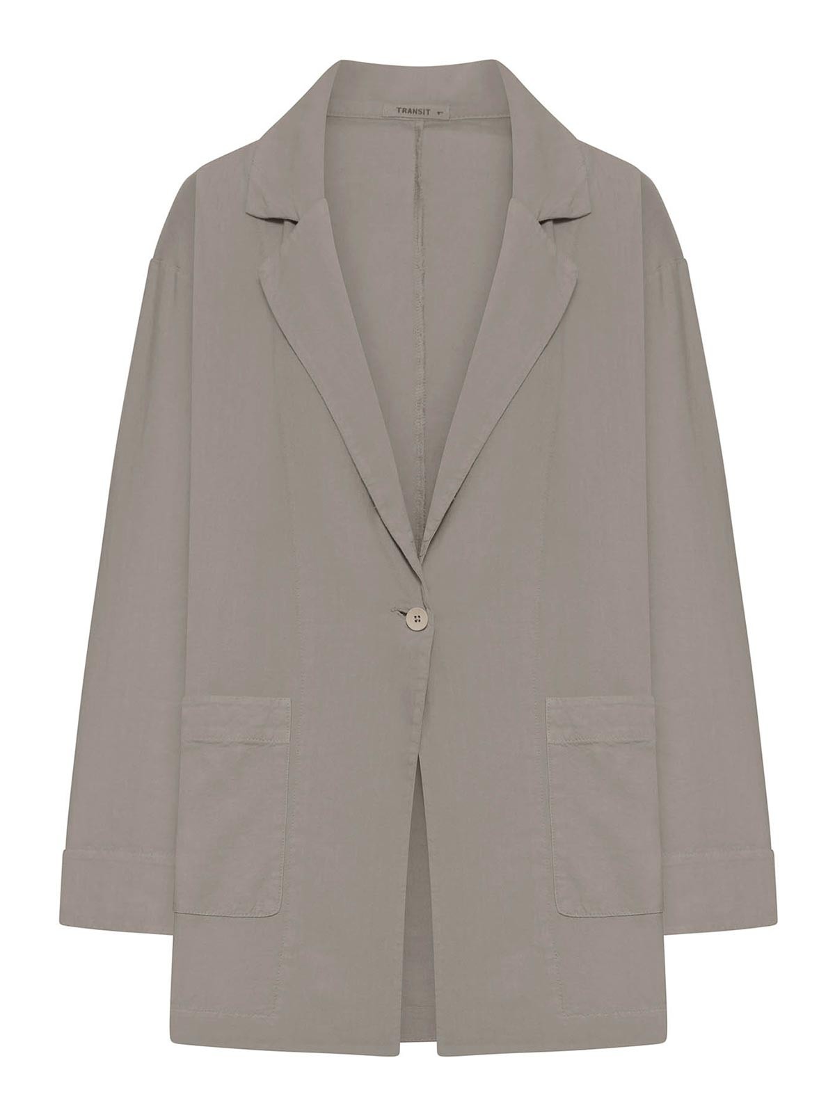 single-breasted blazer, notch lapel, deep neckline, single-button front closure, slightly dropped shoulders, long sleeves with straight cuffs, small slit at the bottom, two front patch pockets, straight fit, relaxed fit, color: grey