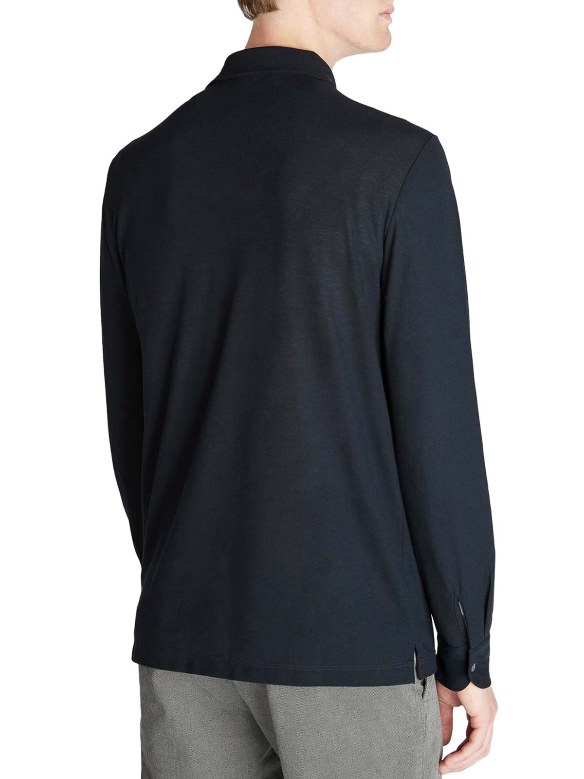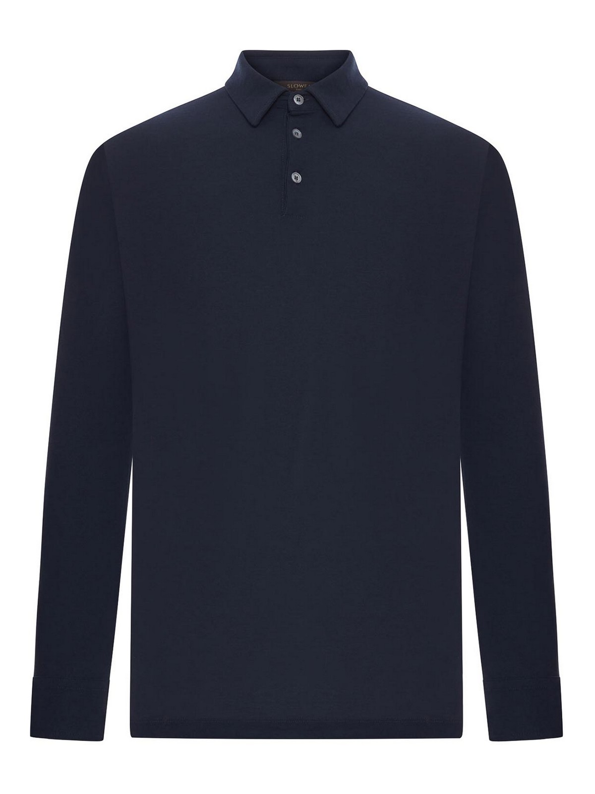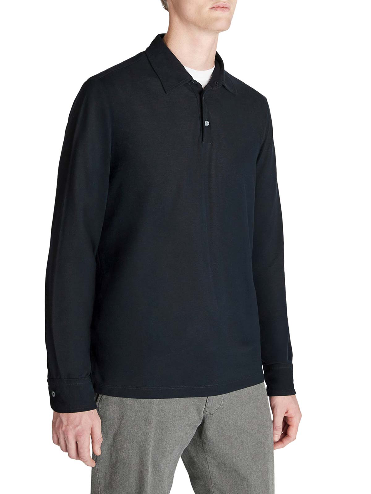polo collar, 3-button front closure, long sleeves, straight hem, ribbed trim, the model is 1.85 m tall and wears a size 50, slim fit, made of icecotton, an exclusive yarn with a strong, lightweight, and breathable structure, with excellent thermoregulation properties, 100% icecotton, color: blue navy