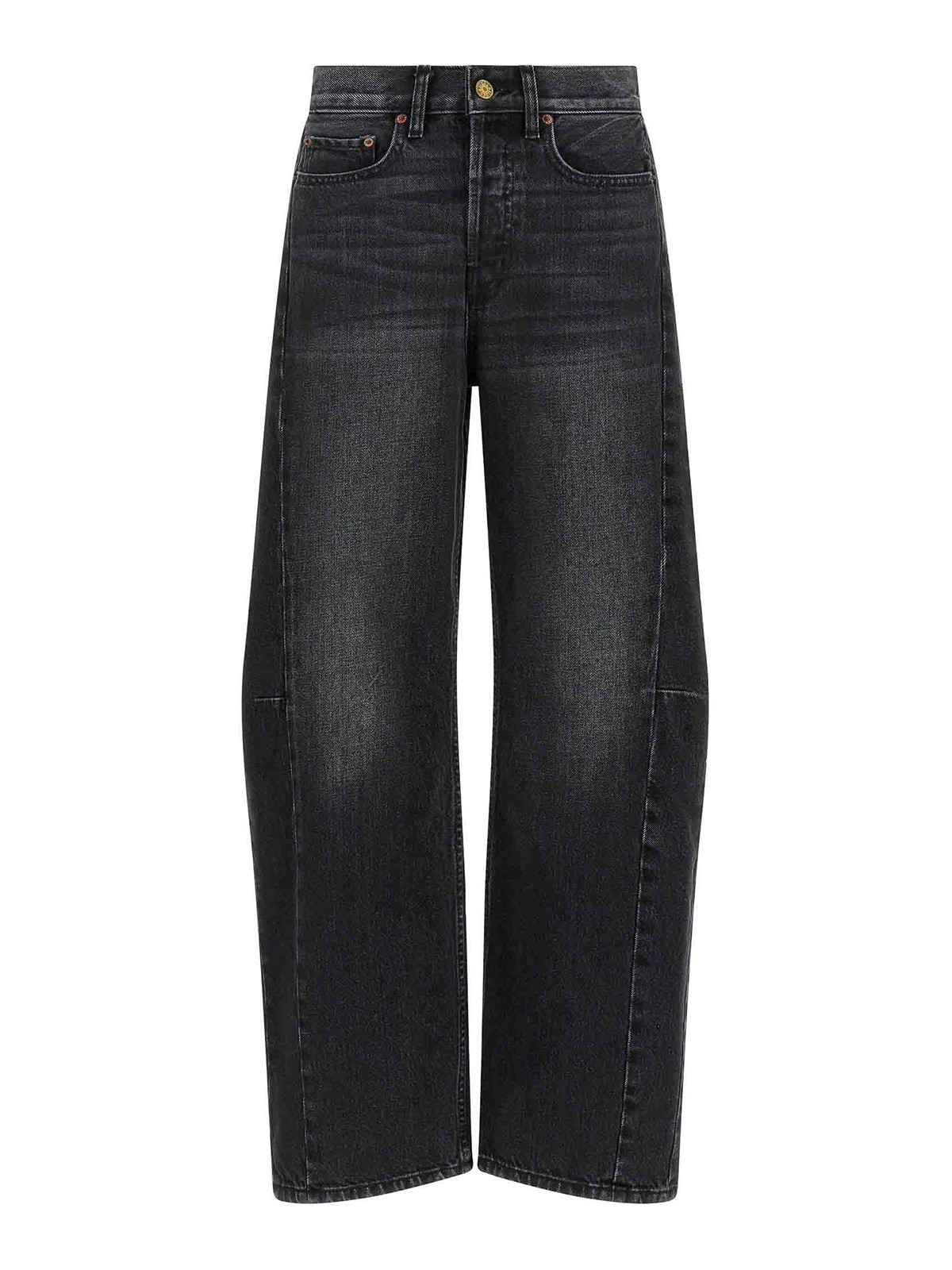 slim lasso' double-sided stonewashed japanese denim jeans with slightly curved wide leg, side pleats, front button closure, five pockets, back logo tag.