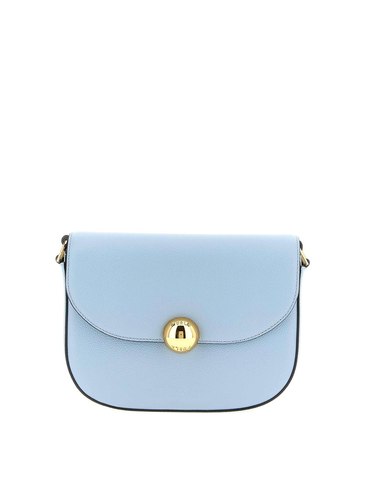 Small fine leather 'furla moonlight' crossbody bag with a light hammered finish, magnetic flap closure with iconic metal 'sfera' logo on the front, embossed logo on the back, and adjustable shoulder strap.
