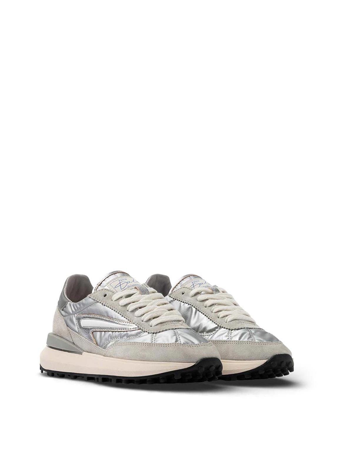 D.a.t.e. athleta nylon silver, running sneakers made of silver-colored nylon with light gray suede inserts, characterized by a dynamic and contemporary aesthetic. the nylon athlete model combines lightness and refined details, maintaining a clean, sporty line. the label with the writing d.a.t.e. sewn on the nylon tongue, while the square logo embossed on the gray leather heel tab. the insert on the external side in silver laminated leather with white printed detail. the 2.3.5 cm high rubber sole guarantees stability and momentum, completed by a 2.5 cm raised internal insole for optimal comfort. all selected leathers are made in Italy. regular fit., nylon upper with light gray suede inserts, label with d.a.t.e writing. sewn on the tongue cotton laces square logo embossed on the heel tab in gray leather side insert in silver laminated leather with white printed detail lining in leather and fabric 2.5 cm raised internal insole 2.3.5 cm high rubber sole regular fit, upper composition: nylon, suede and leather lining: leather and fabric sole: rubber