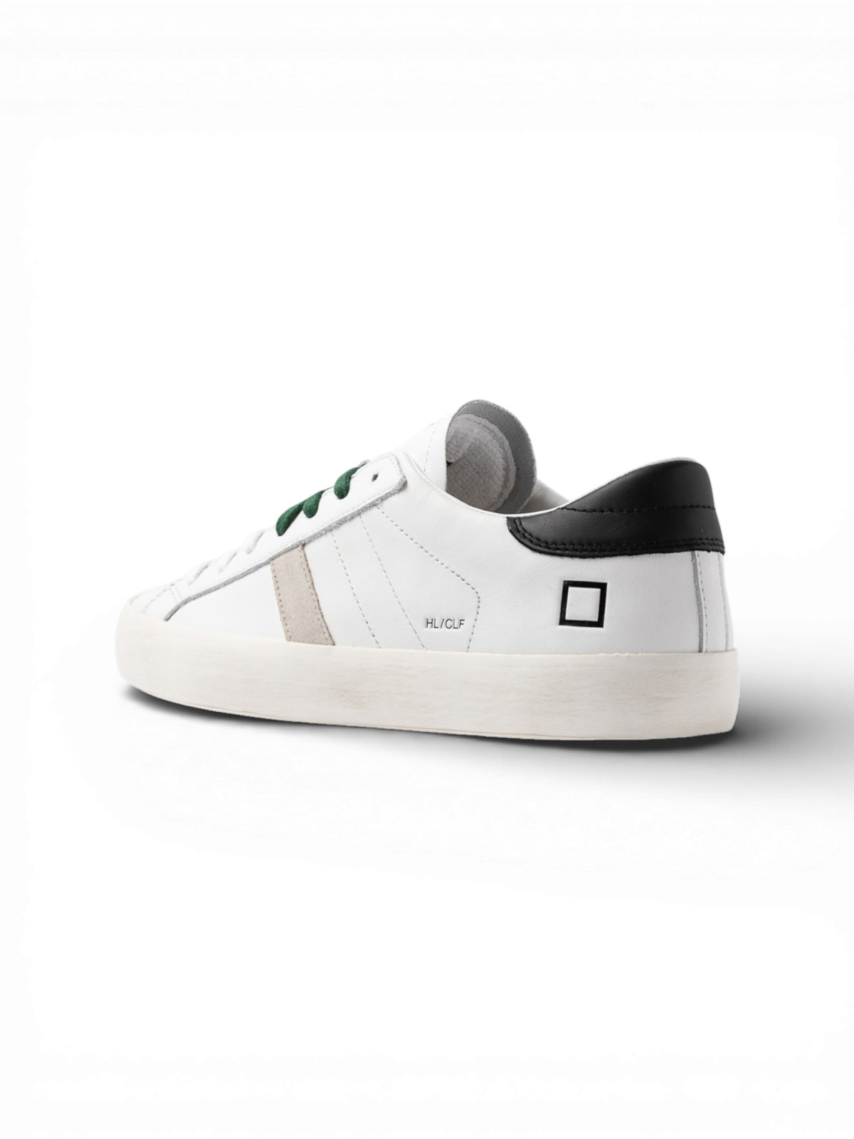 D.a.t.e. hill low calf white-black leather, low sneaker made of leather, characterized by an essential design and contrasting details that define its contemporary identity. the hill low calf model combines formal cleanliness and structural comfort, maintaining a versatile and recognizable aesthetic. the leather tongue features the writing d.a.t.e. printed in tone, while the square logo and model name are printed on the side. the suede side band and the contrasting leather rear heel tab enhance the profile of the shoe. the internal structure, with leather and cotton sponge lining and raised insole, guarantees comfort in daily use., leather upper, leather tongue with d.a.t.e writing. embossed cotton laces in two different colors square logo and model name embossed on the side side band in suede leather rear heel lining in leather and cotton terry 2 cm raised internal insole 3 cm high rubber sole regular fit, upper composition: leather and suede lining: leather and cotton terry sole: rubber