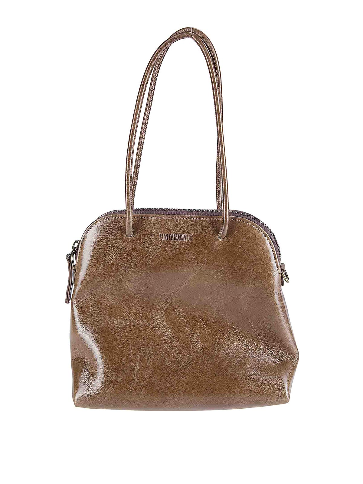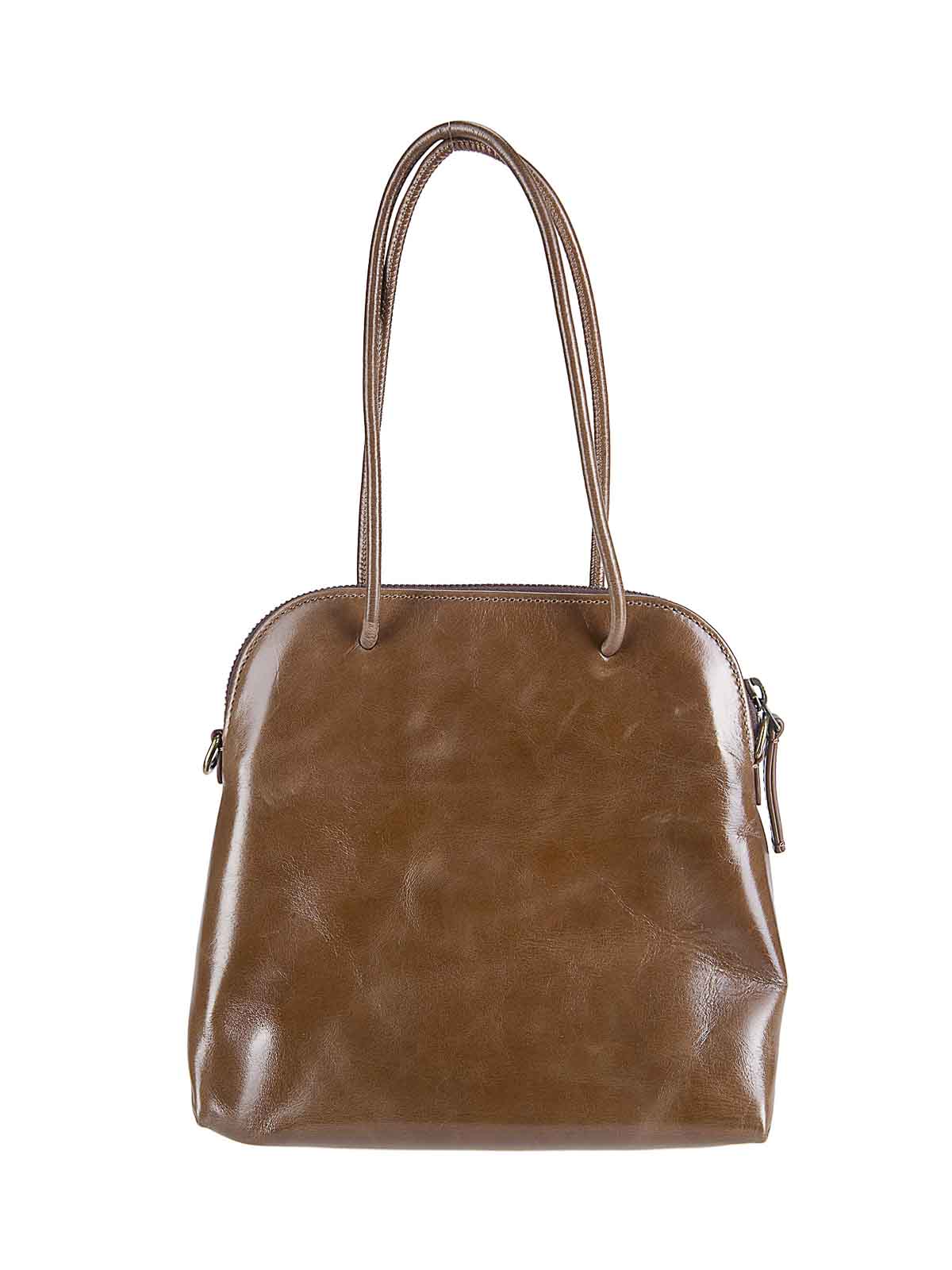 Shiny leather bag with handles, small size, zip closure, removable shoulder strap.