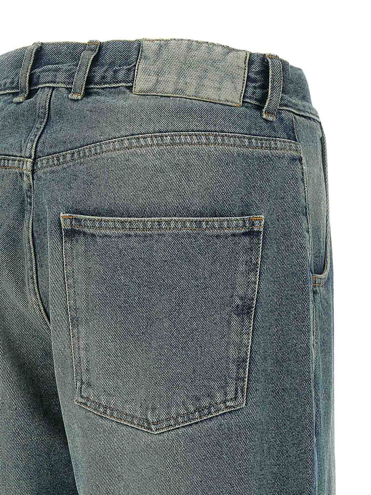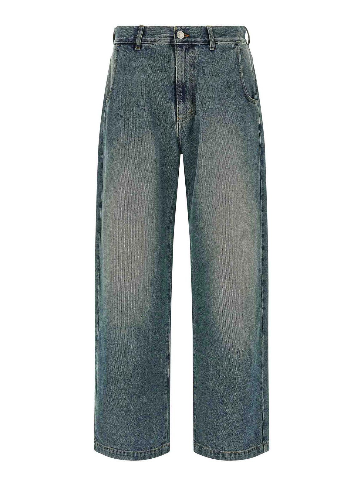 straight cut' vintage-effect cotton denim jeans, contrast stitching, medium waist, wide and straight leg, front zip and button closure, five pockets, back trompe l'oeil logo tag. this garment is made with carefully selected denim and finished with a finishing process designed to create a vintage effect. each piece is unique in tone and character. with time and use, the garment will evolve naturally, taking on unique characteristics.