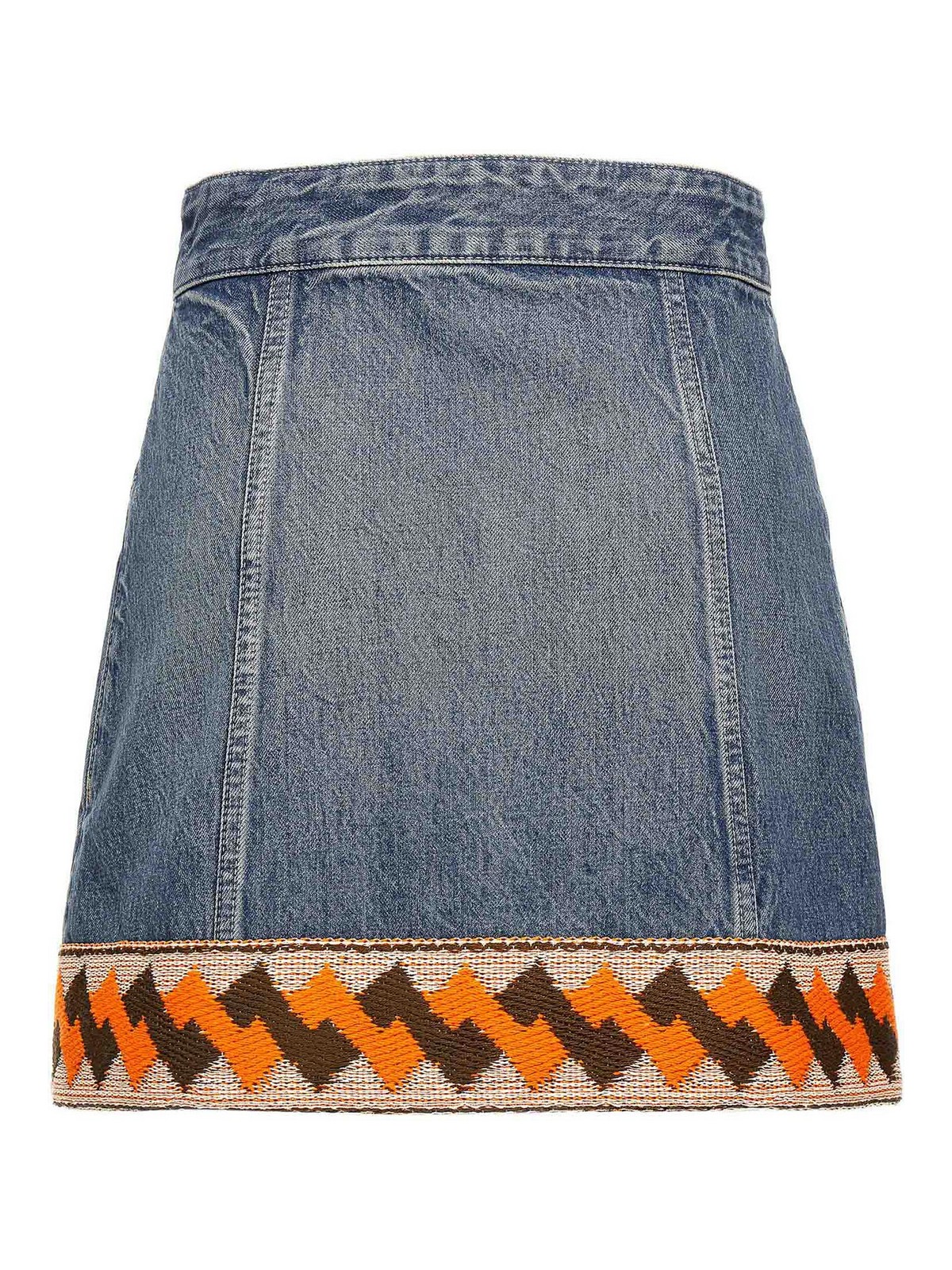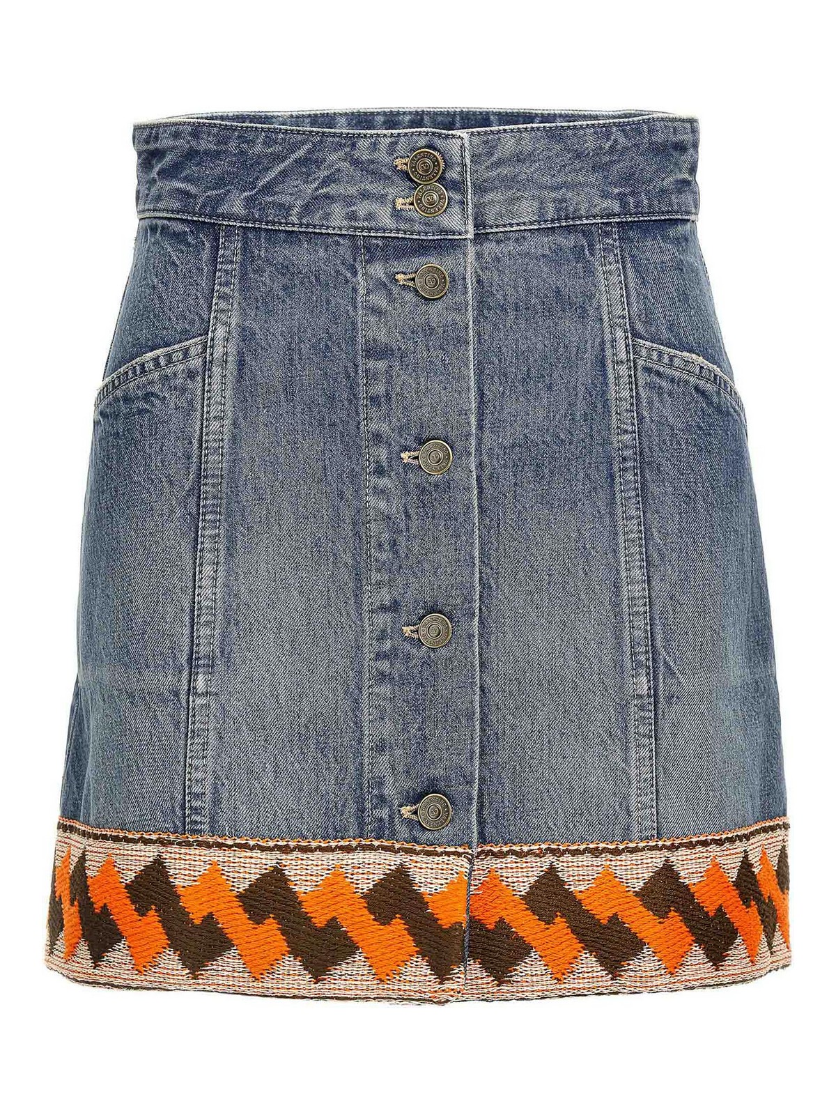 Cotton denim mini skirt with trimming detail on the hem, front button closure, pockets.