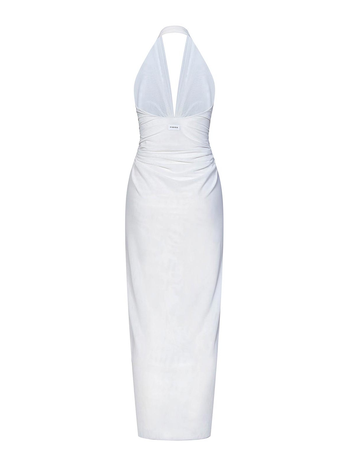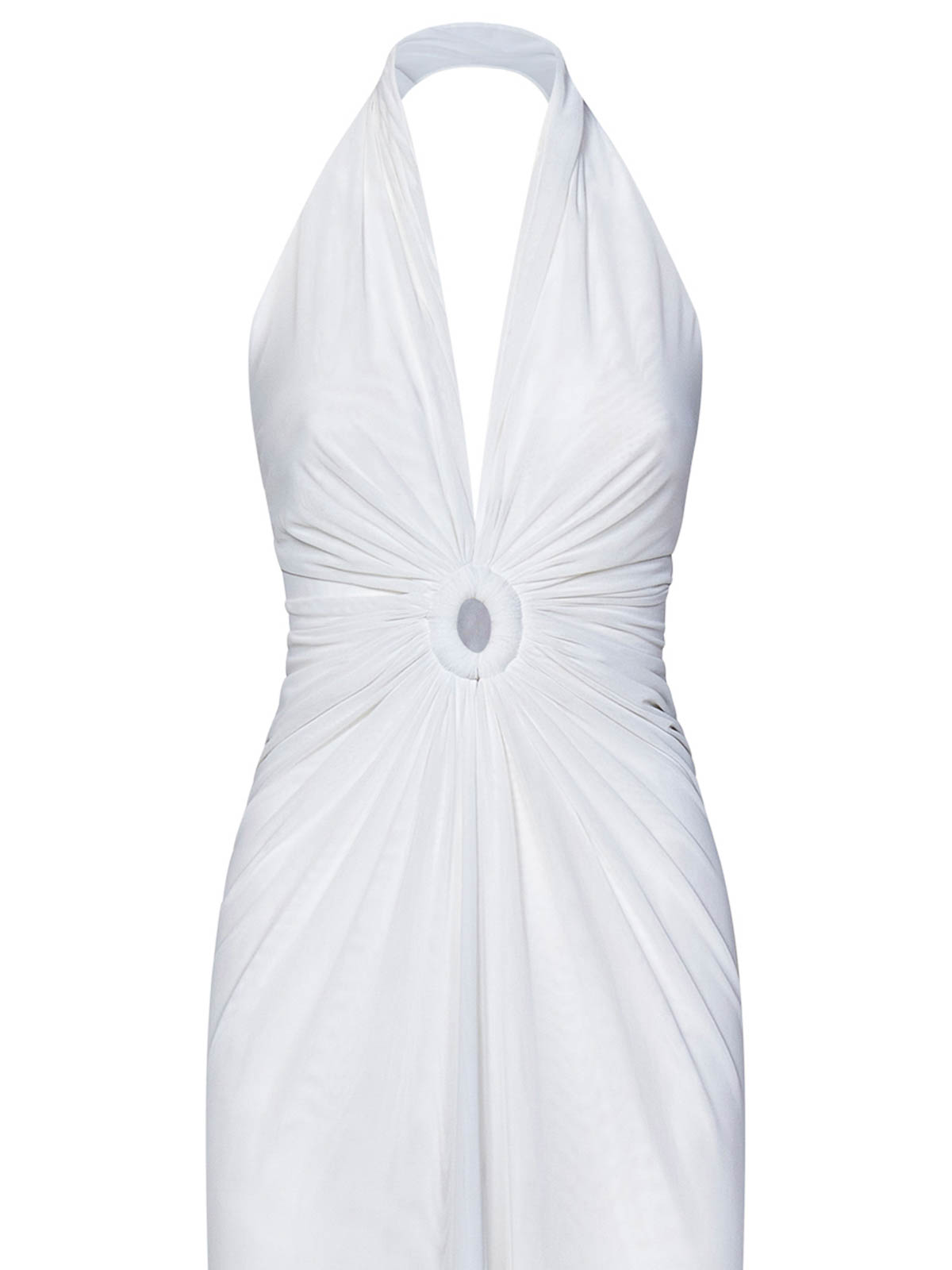 Halter neckline ring on the with curls slit on the backless logo label sewn on the back ankle length white color