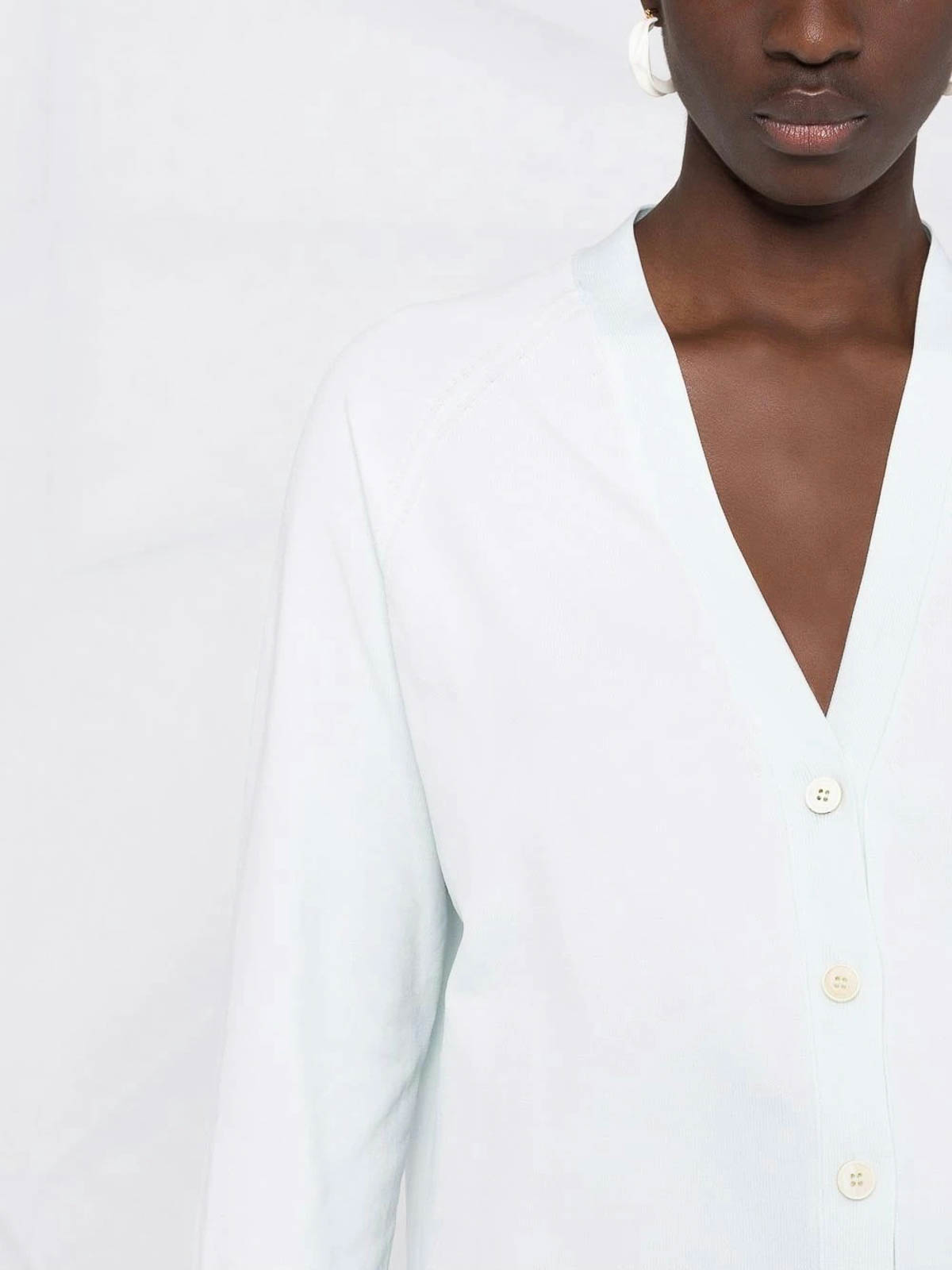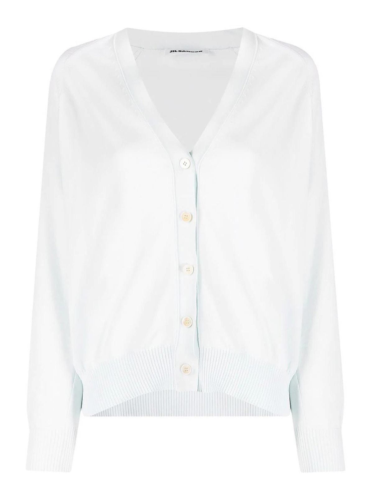 This v-neck cardigan by jil sander will either make you love knitwear or love it even more. its sophisticated but slouchy design and the light color scheme is really beautiful to look at dont even get.mes started on the comfort of it its phenomenal. 97% polyamide, 3% elastane , light blue, front button fastening, ribbed-knit edge, drop shoulder, long sleeves, made in italy washing instructions: dry clean only designer style id: jsps754066 wsy46058 color id: 459