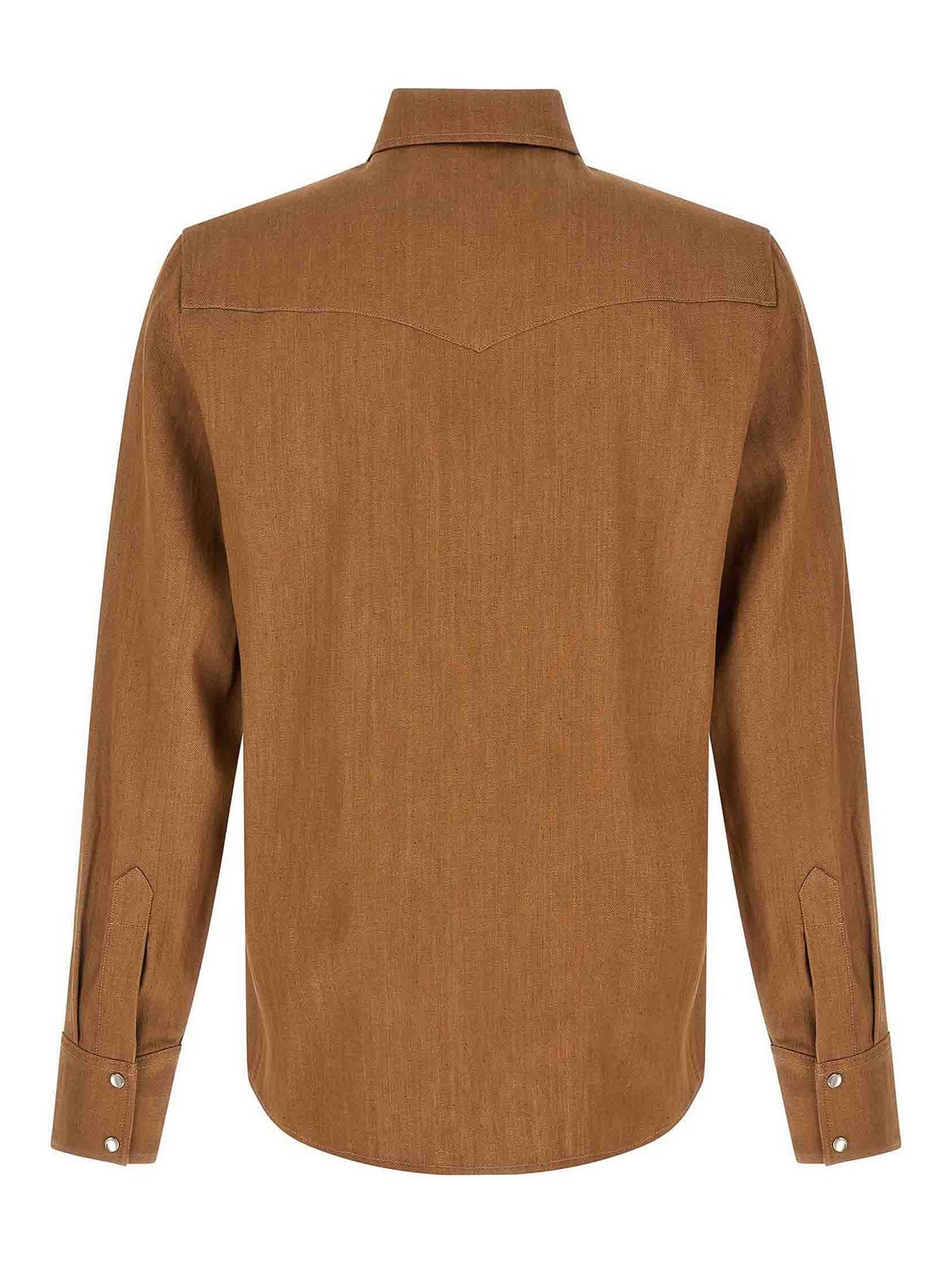 western' shirt in garment-dyed cotton denim with pointed collar, front snap button closure, pockets, long cuffed sleeves.