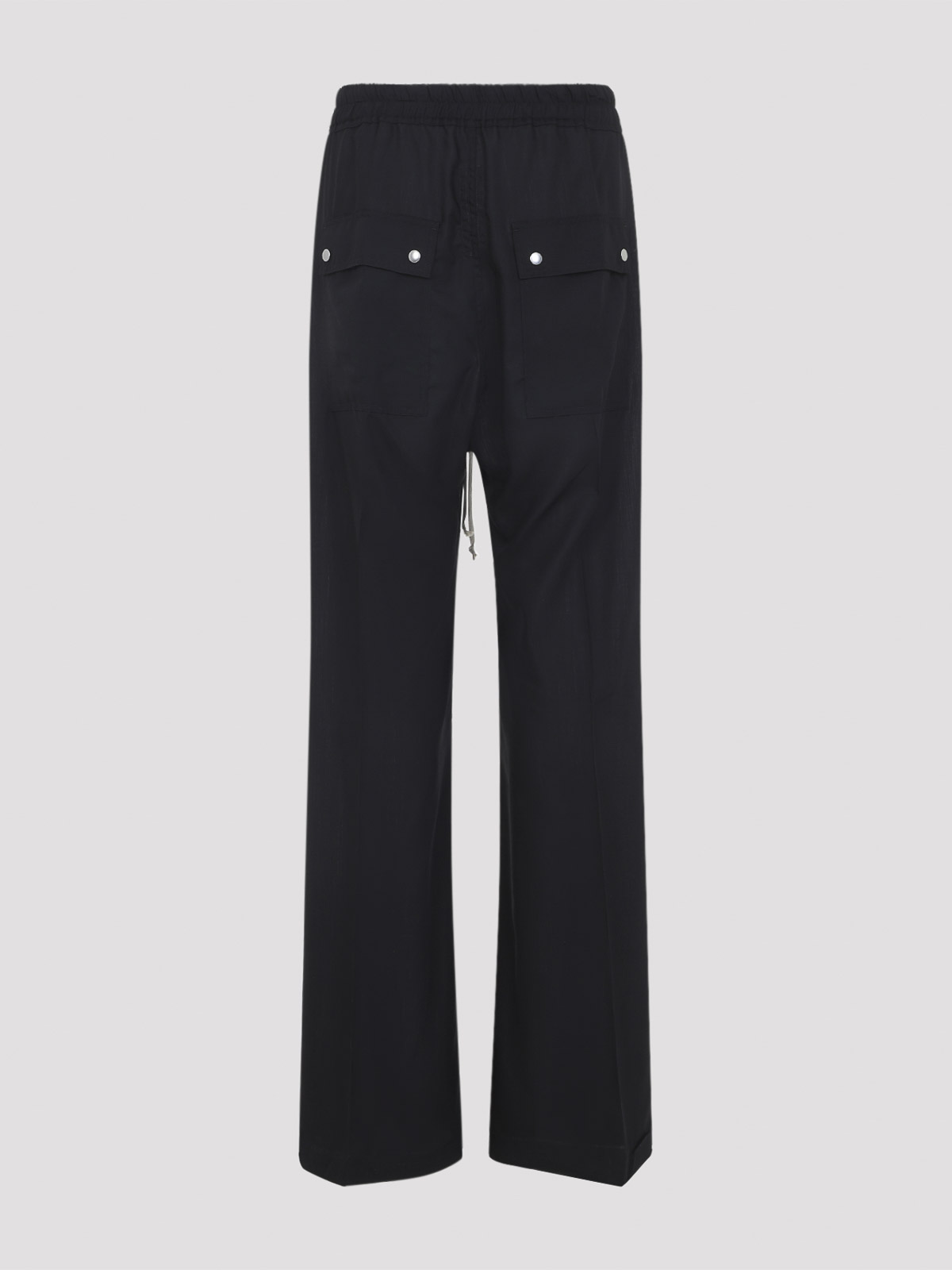 Rick owens wide bela black virgin wool pants. full-length pants crafted from black virgin wool, featuring an elastic waistband with the iconic drawstring, a low crotch, a front zip fastening, silver-toned metal eyelet detailing, slant pockets, side vents, two flap pockets at the back, and a wide leg.