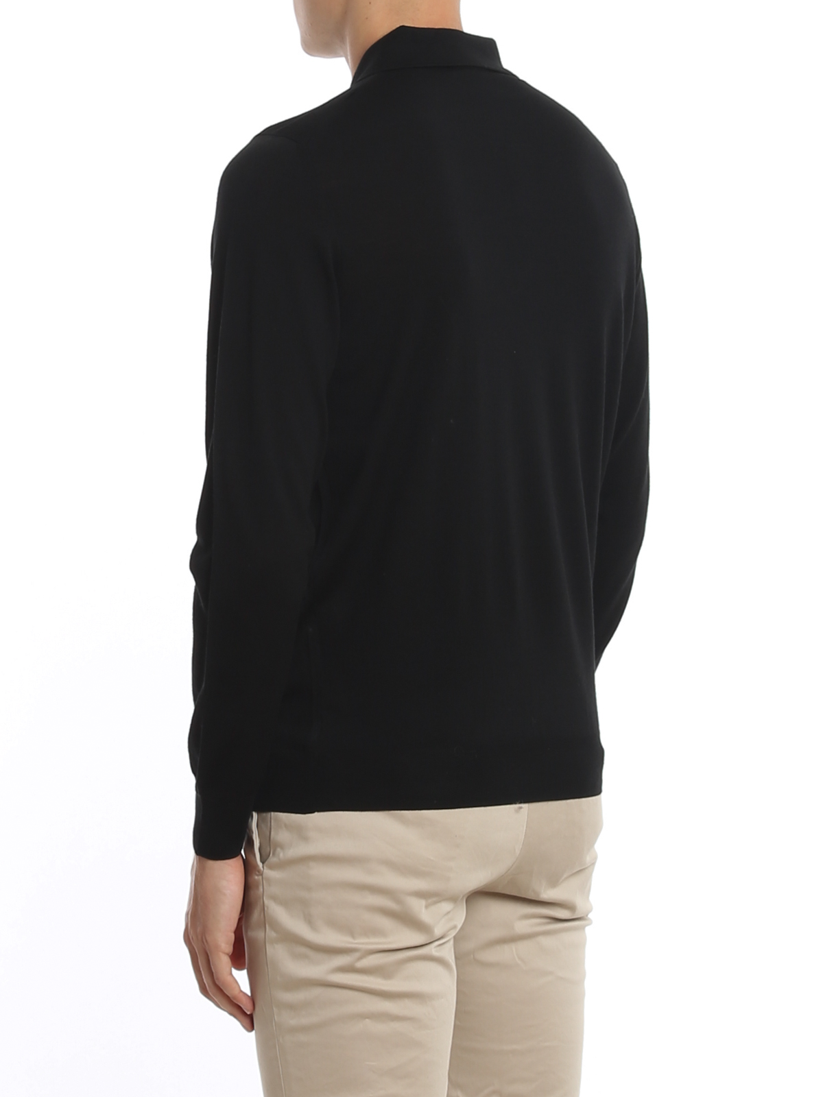 Stocking stitch worsted wool long-sleeved polo featuring ribbed edges. Modern Capsule.